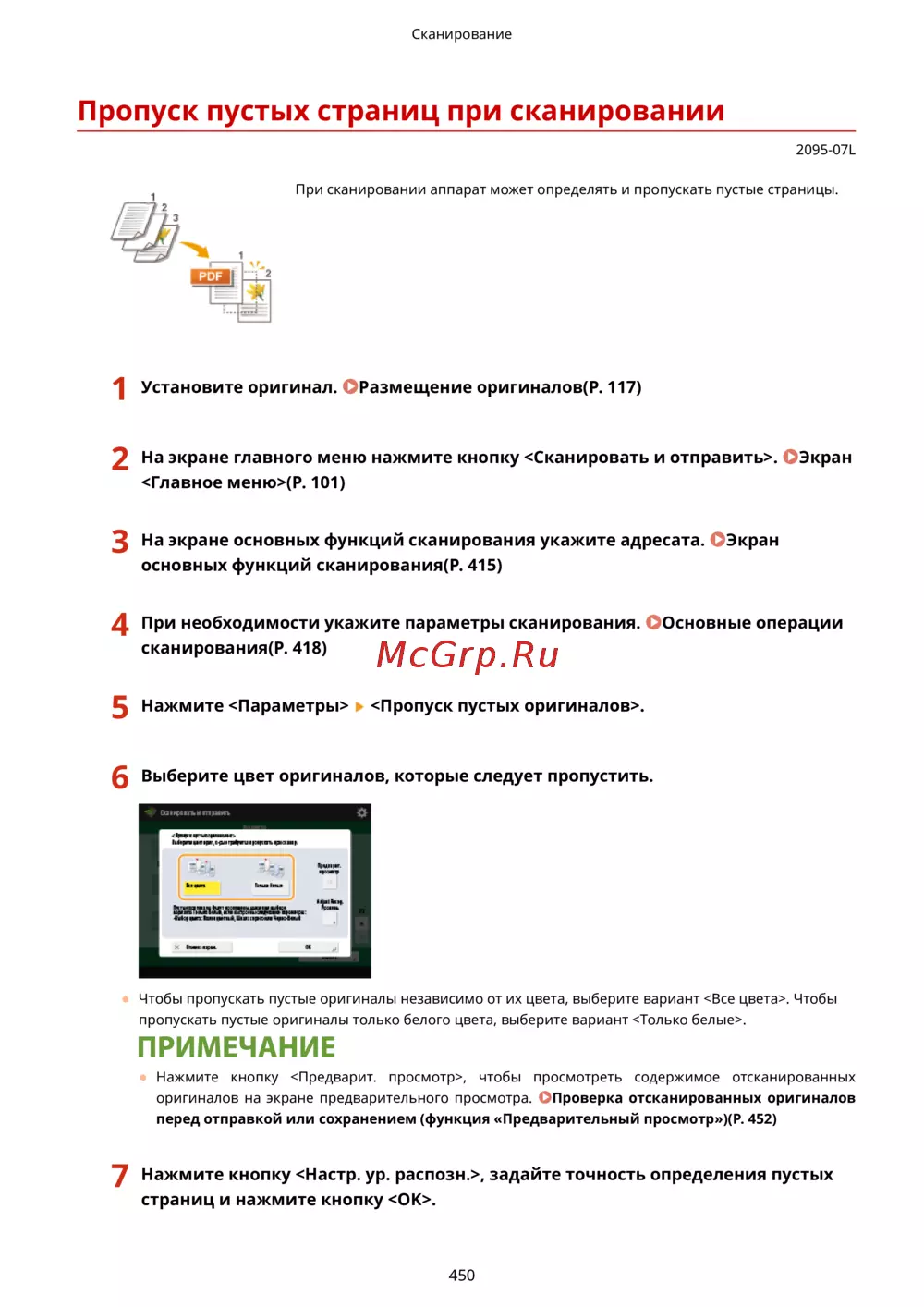При сканировании аппарат может определять и пропускать пустые страницы.