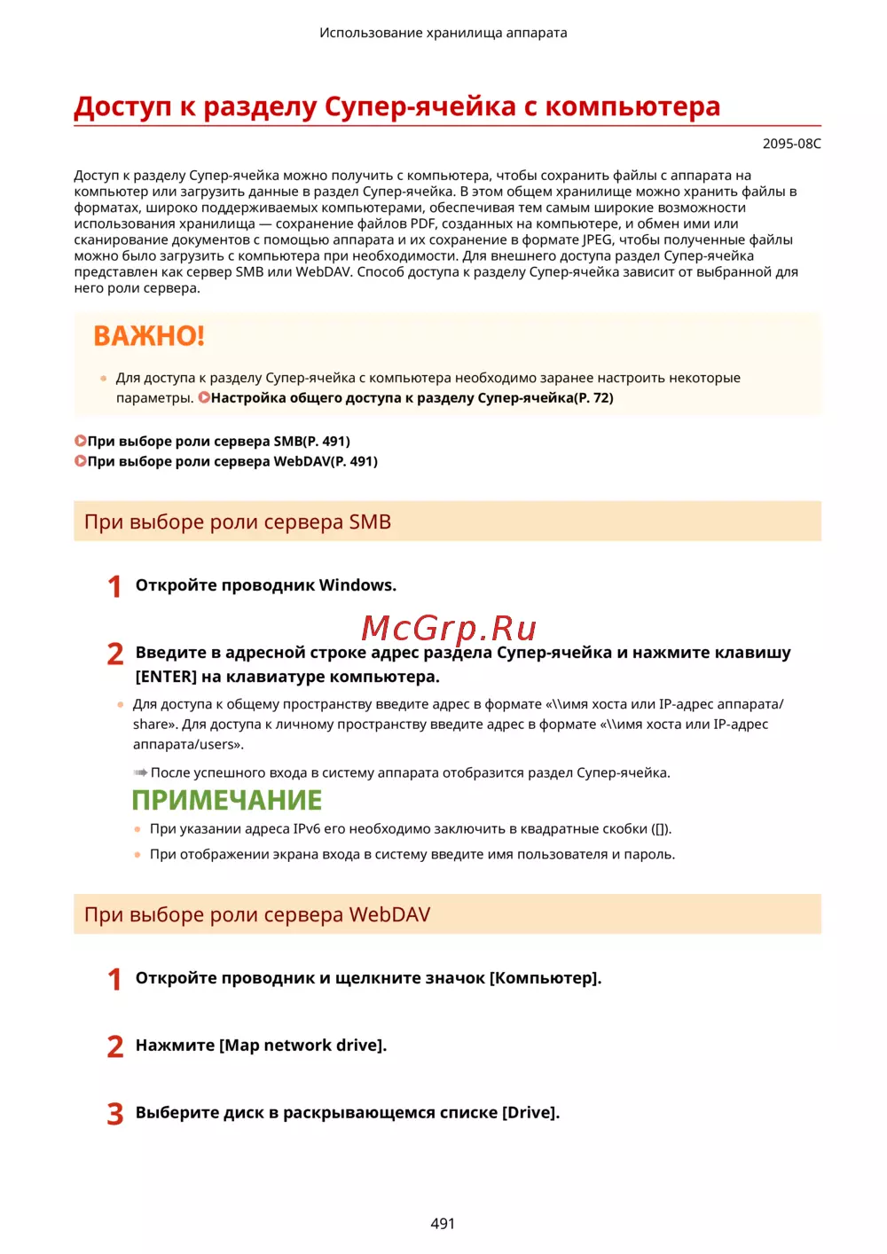 представлен как сервер SMB или WebDAV. Способ доступа к разделу Супер-ячейка зависит от выбранной для