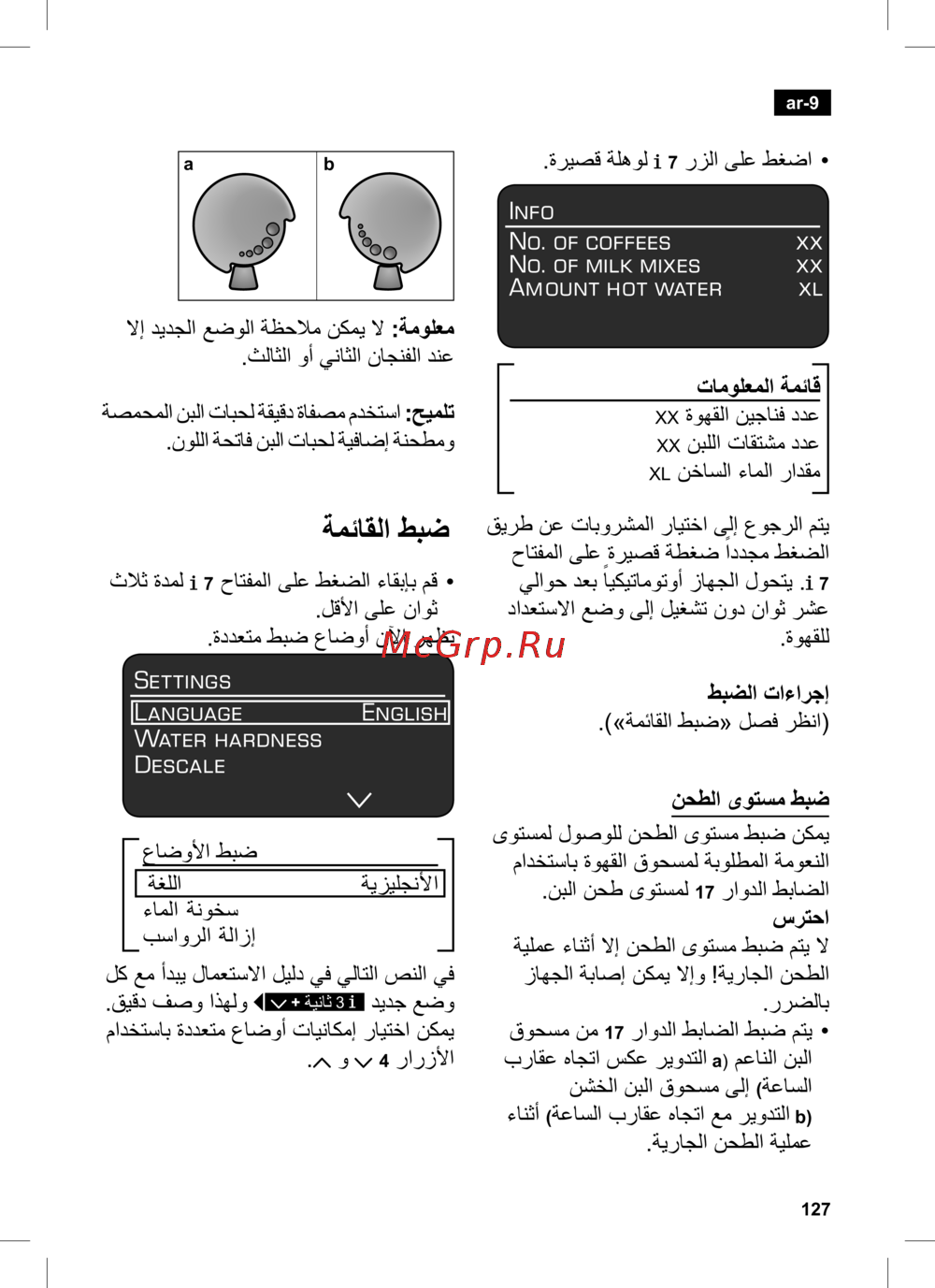 ar 9 INFO______________ NO OF COFFEES No OF MILK MIXES AMOUNT HOT WATER XX XX XL 1 41 11 j _jlall J L 4ll Vic 1 A a all A 4 Allj 1 1 AÍ J óli XL LJ JAAII JIJJ I SETTINGS LANGUAGE______ ENGLISH WATER HARDNESS ESCALE all jl La 11 j ll JJ huÁll 01 1 J l AiU Loll j i htJ ll AJI I J a ÍÚJJ JLaxJxu i l JJj 4 JJ3J i aj I AjA a j jjJLSJl c3 1 4 c LuJl Ijjl ÁX LAII i OL JI A j iill b 127