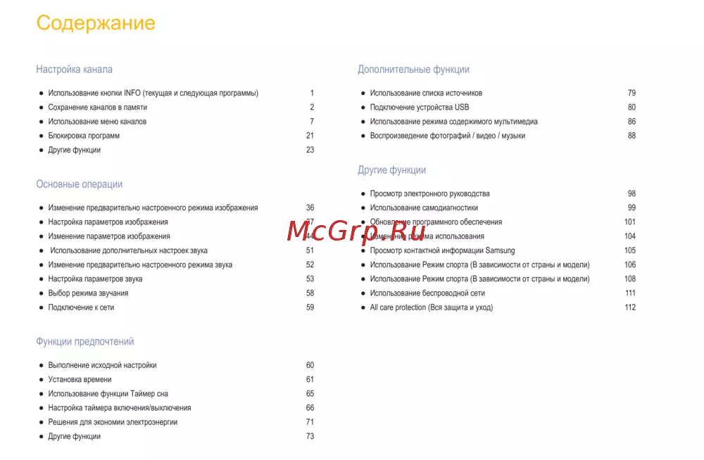Использование Режим спорта (В зависимости от страны и модели) 106