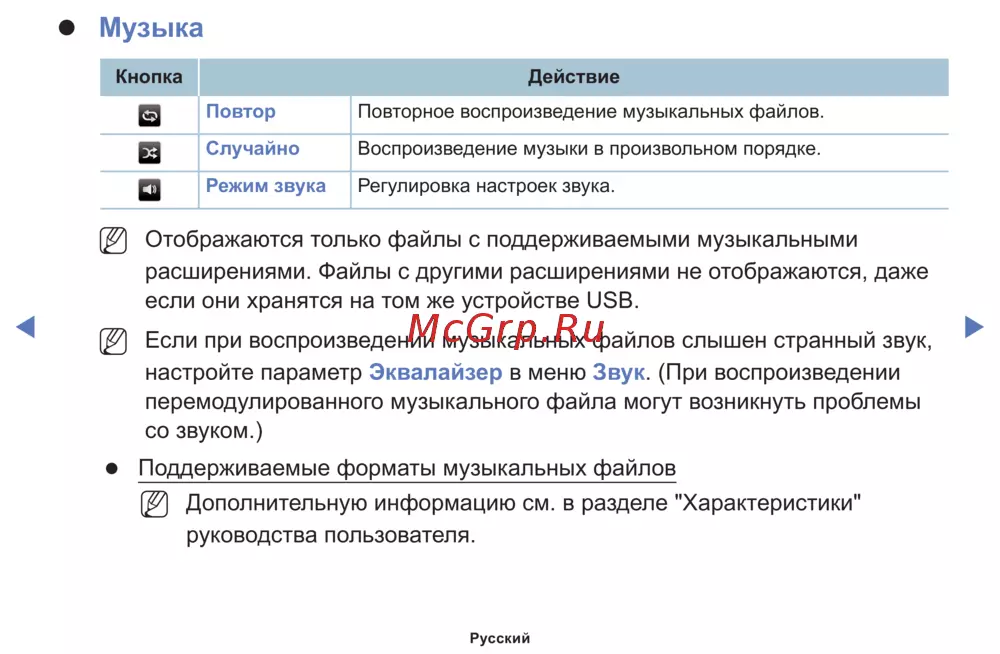 Повтор Повторное воспроизведение музыкальных файлов.