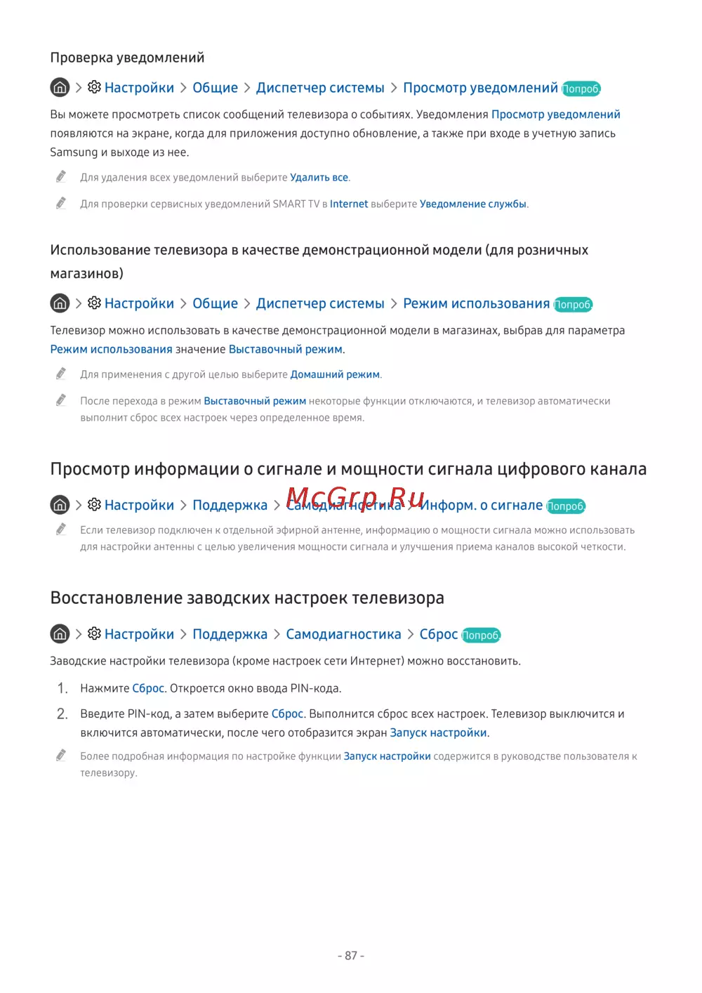 " После перехода в режим Выставочный режим некоторые функции отключаются, и телевизор автоматически