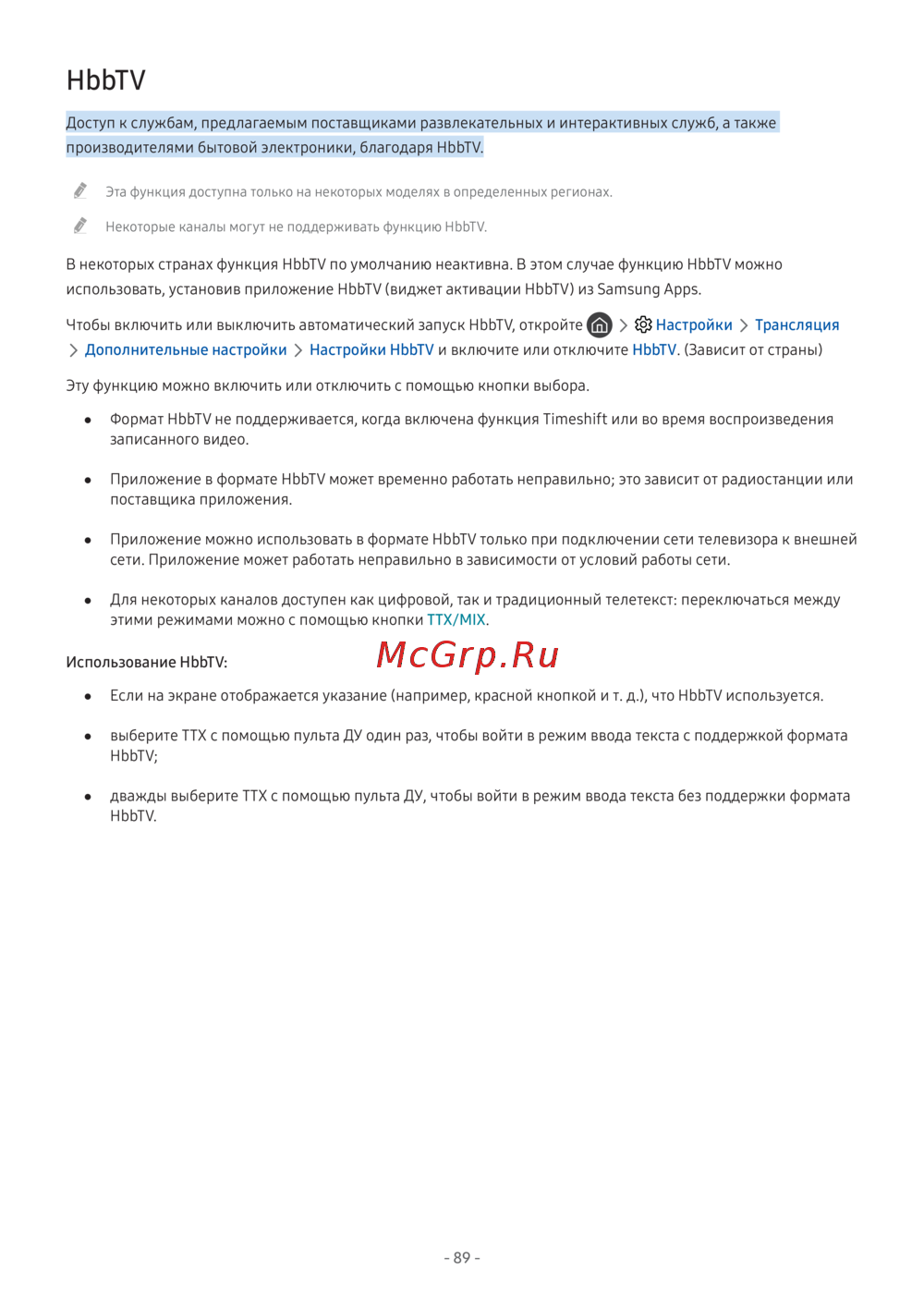 ● Формат HbbTV не поддерживается, когда включена функция Timeshift или во время воспроизведения