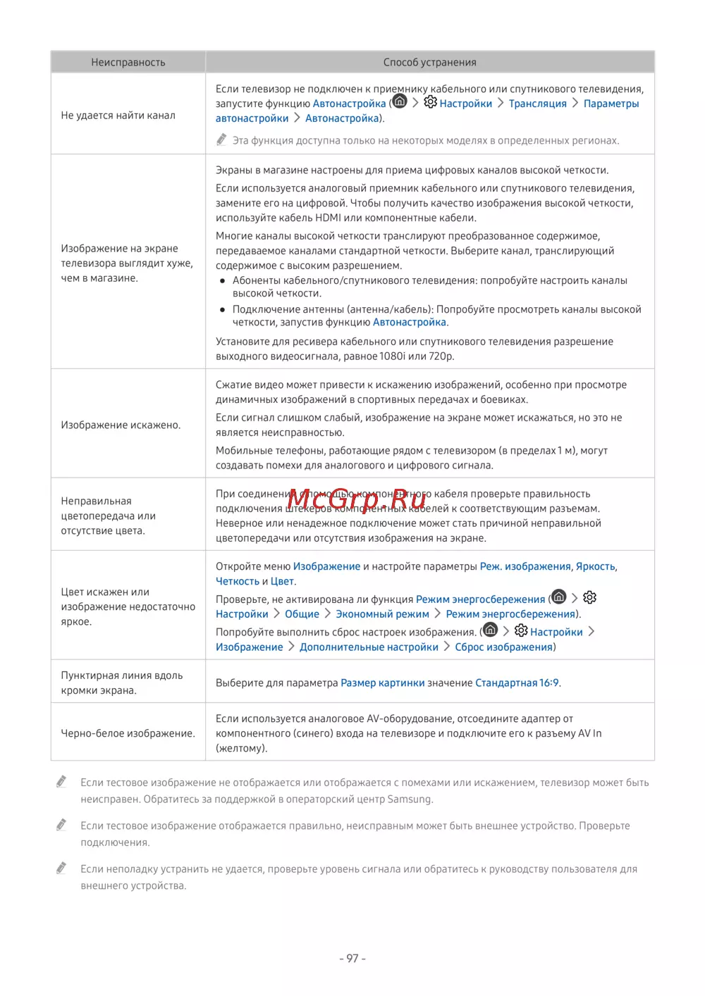 " Если тестовое изображение не отображается или отображается с помехами или искажением, телевизор может быть