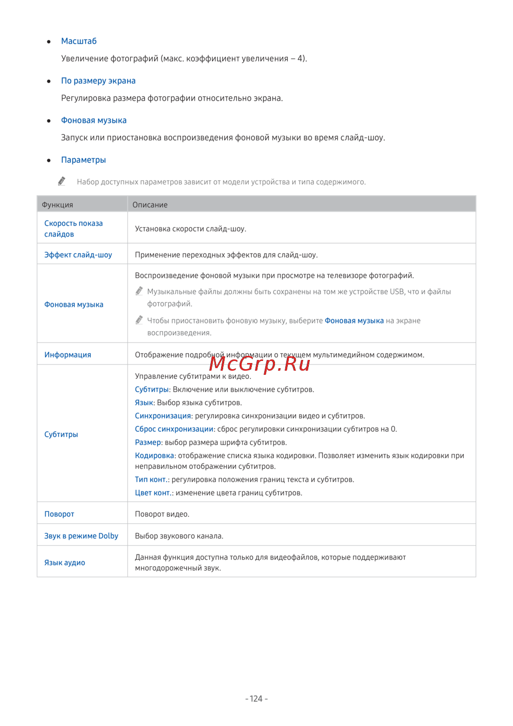" Набор доступных параметров зависит от модели устройства и типа содержимого.