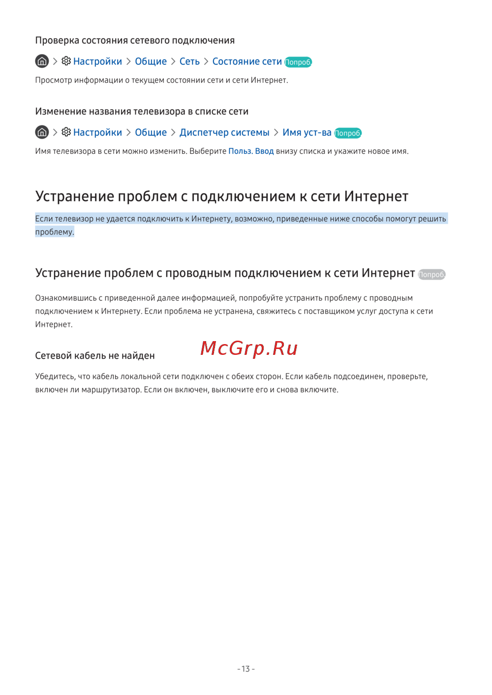 Samsung UE43M5513AU [19/155] Устранение проблем с проводным подключением к сети интернет попроб