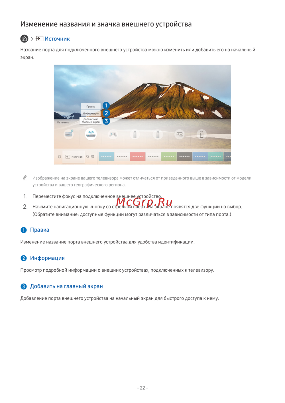 - Источник выбор внешнего устройства подключенного к телевизору p.151