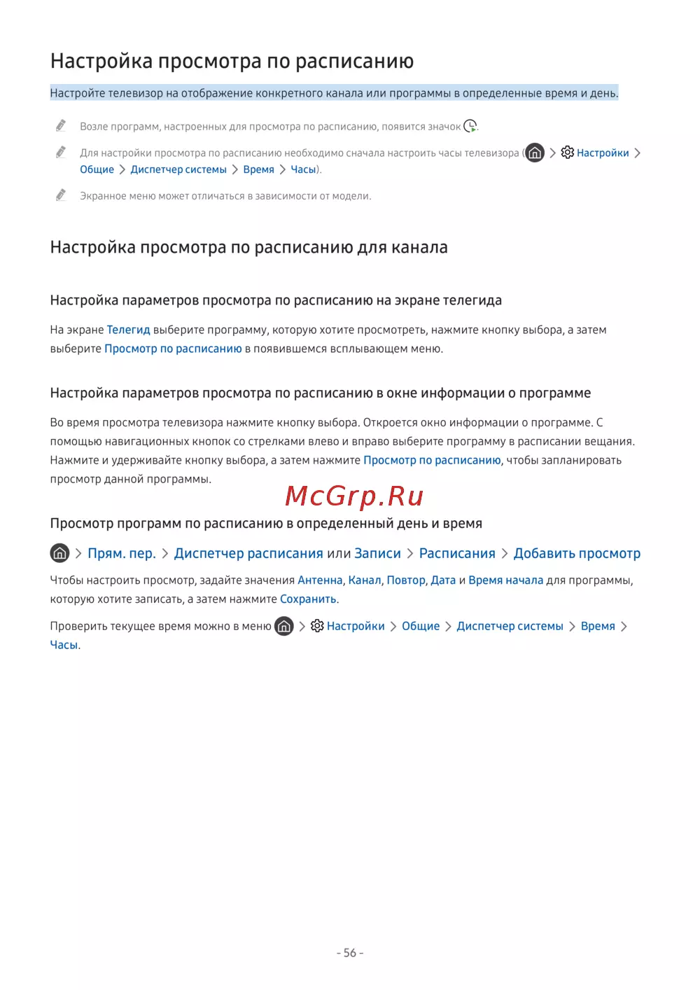 " Для настройки просмотра по расписанию необходимо сначала настроить часы телевизора ( Настройки