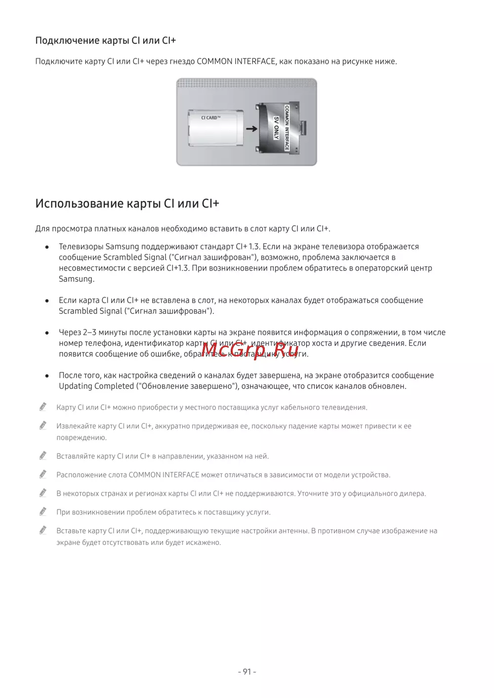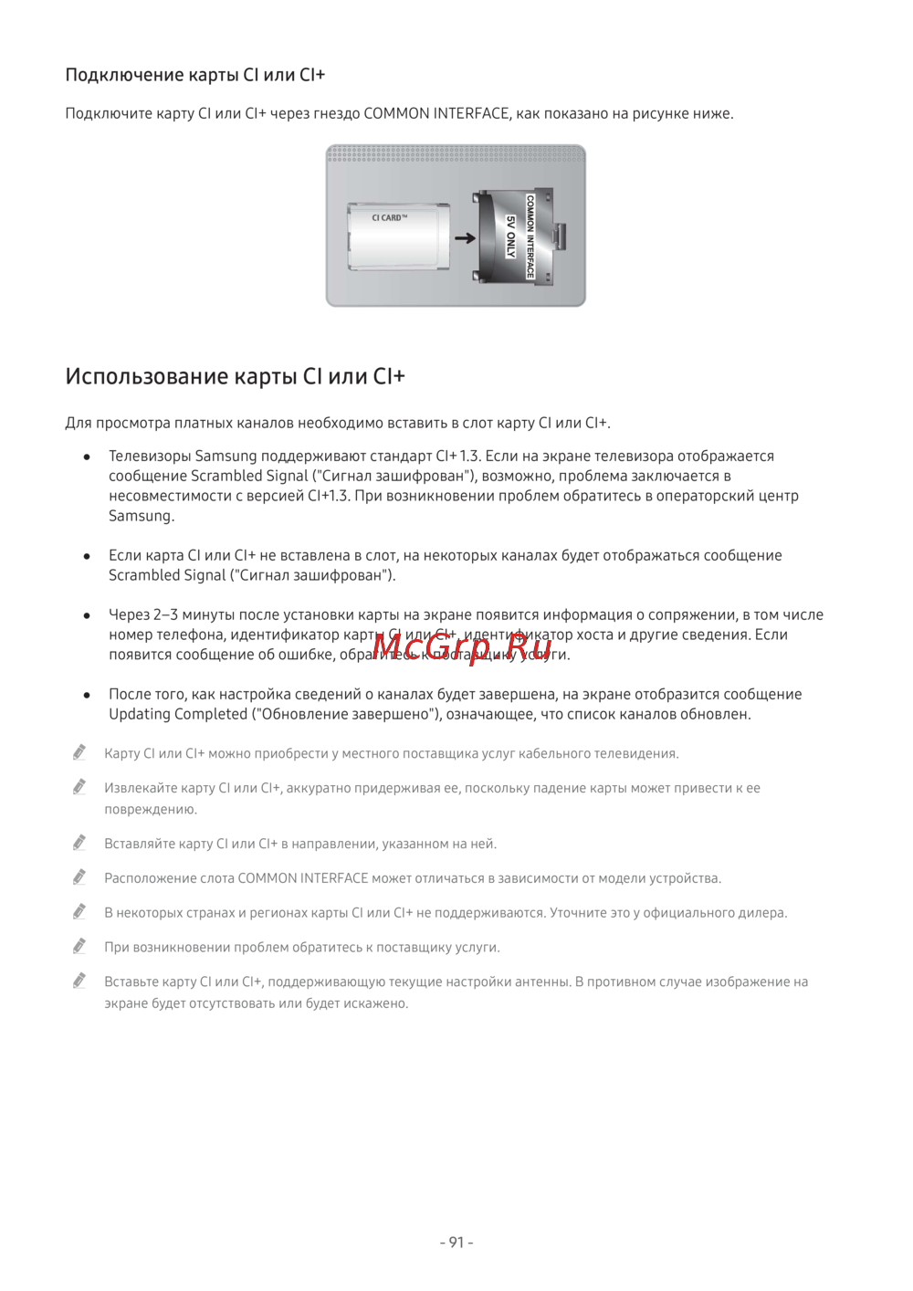 ● Телевизоры Samsung поддерживают стандарт CI+ 1.3. Если на экране телевизора отображается