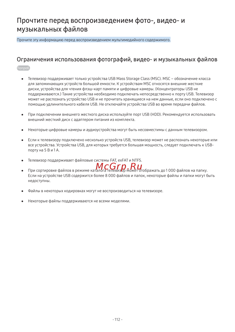 ● Телевизор поддерживает только устройства USB Mass Storage Class (MSC). MSC– обозначение класса