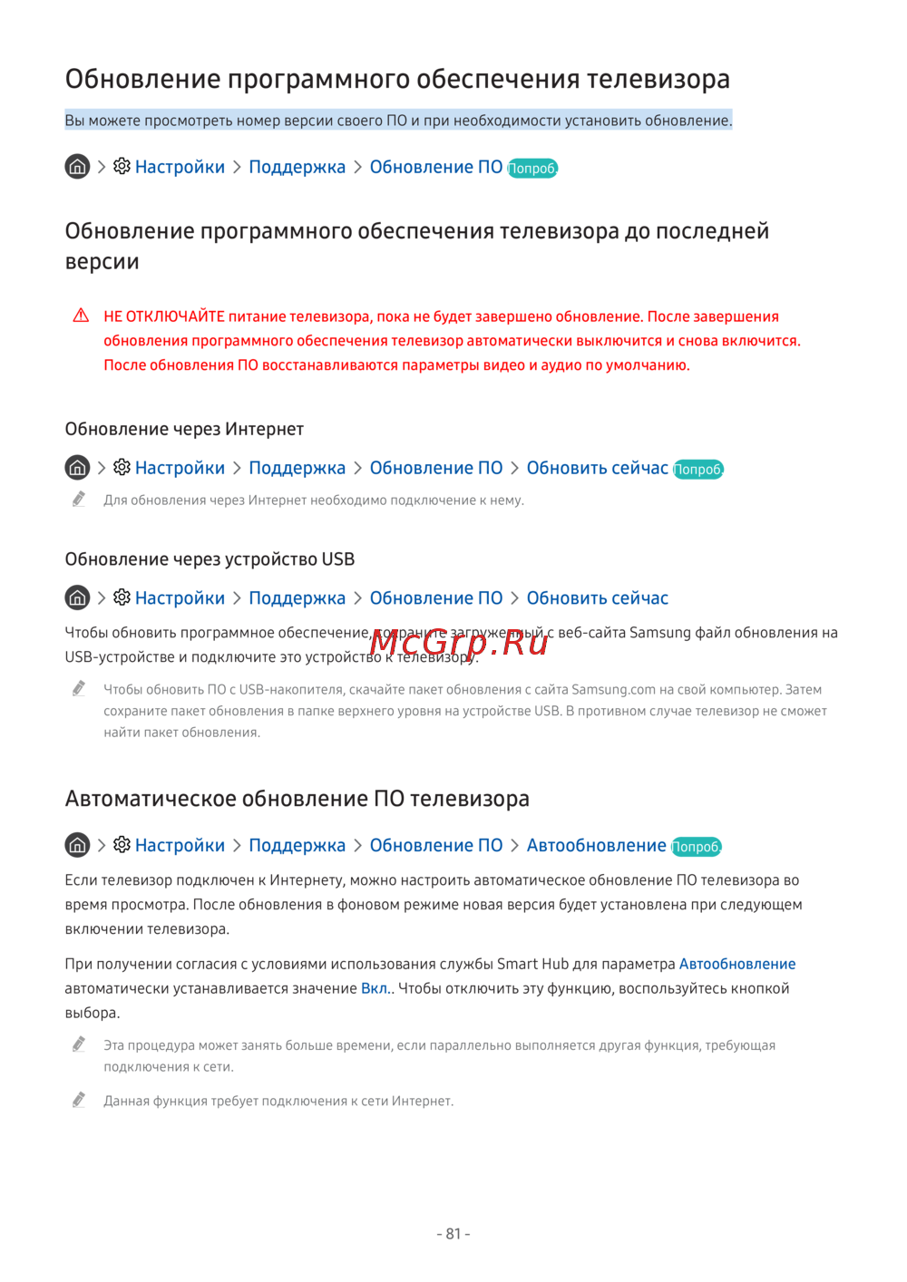 " Чтобы обновить ПО с USB-накопителя, скачайте пакет обновления с сайта Samsung.com на свой компьютер. Затем