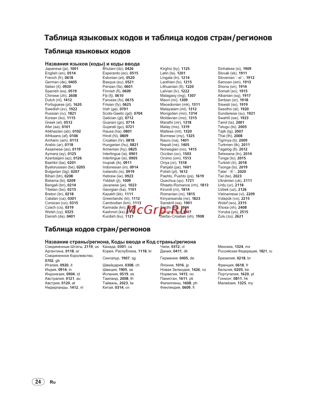 - Таблица языковых кодов и таблица кодов стран регионов p.24
