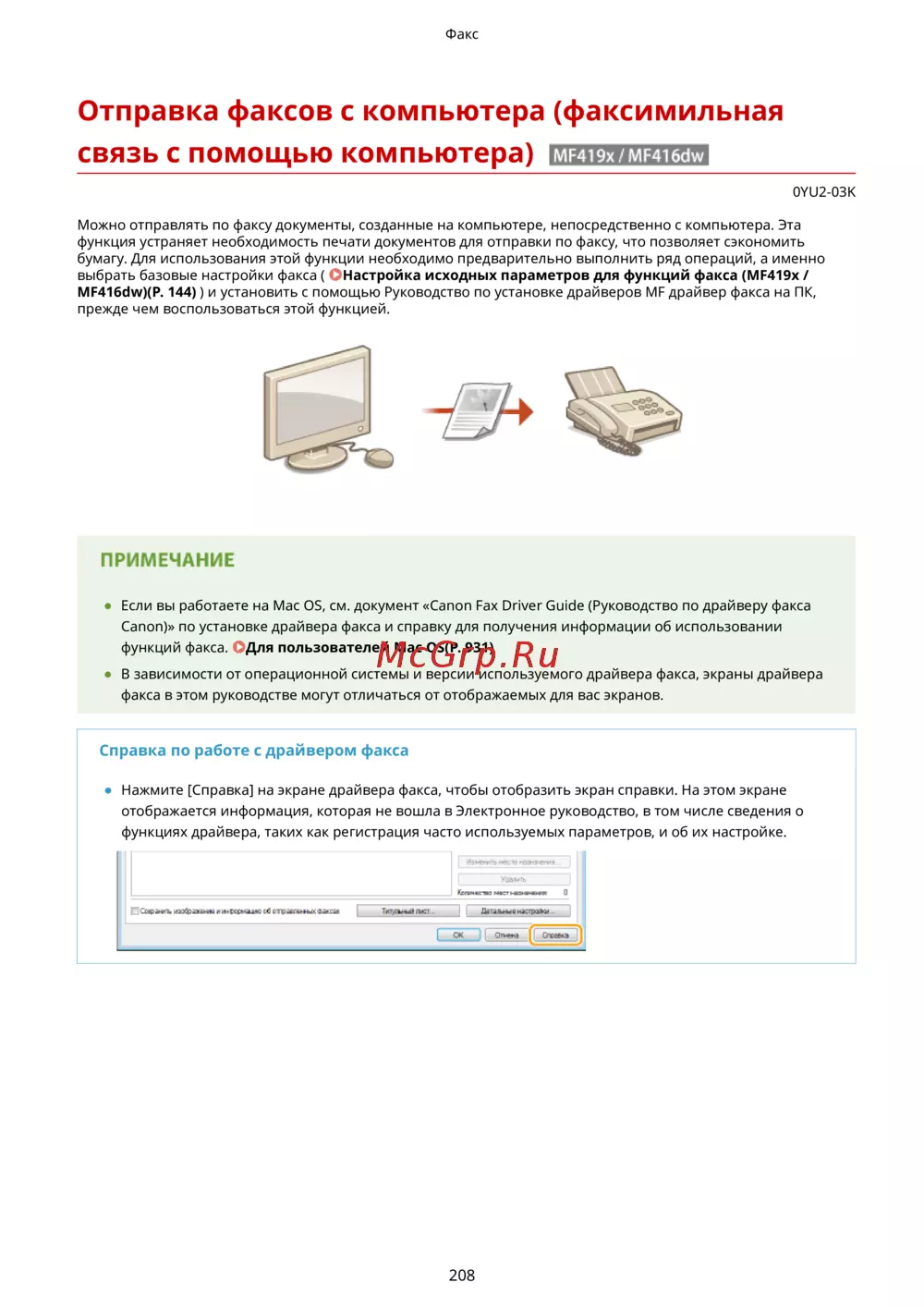 MF416dw)(P. 144) ) и установить с помощью Руководство по установке драйверов MF драйвер факса на ПК,