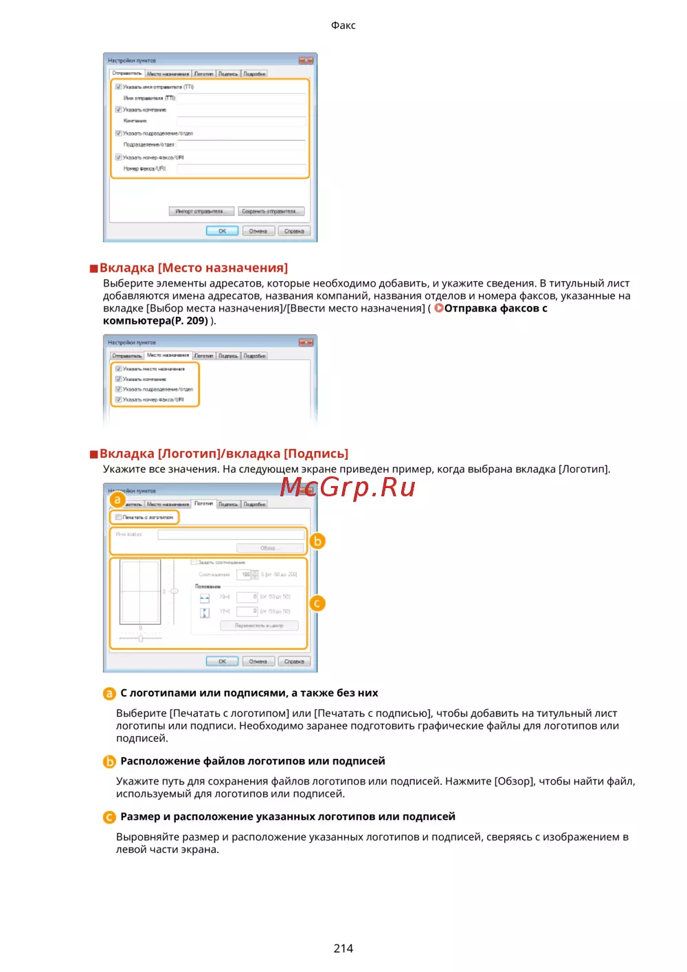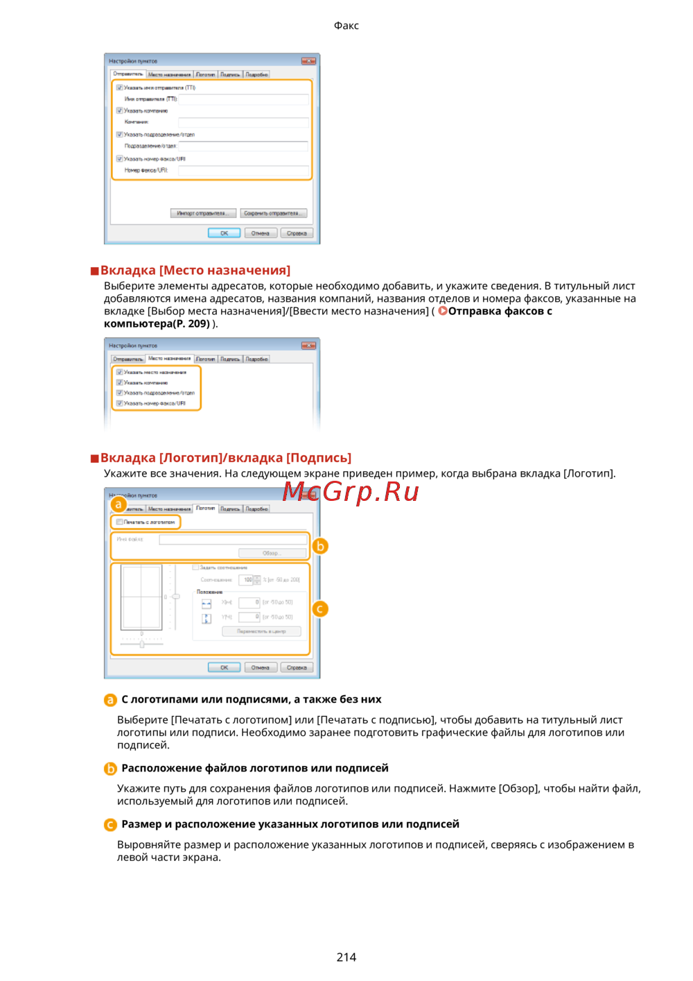 Canon i-Sensys MF416dw Лазерный \ светодиодный, Серый, Черно-белая, А4 — настройка титульного листа: логотипы и подписи для факсов [224/949]