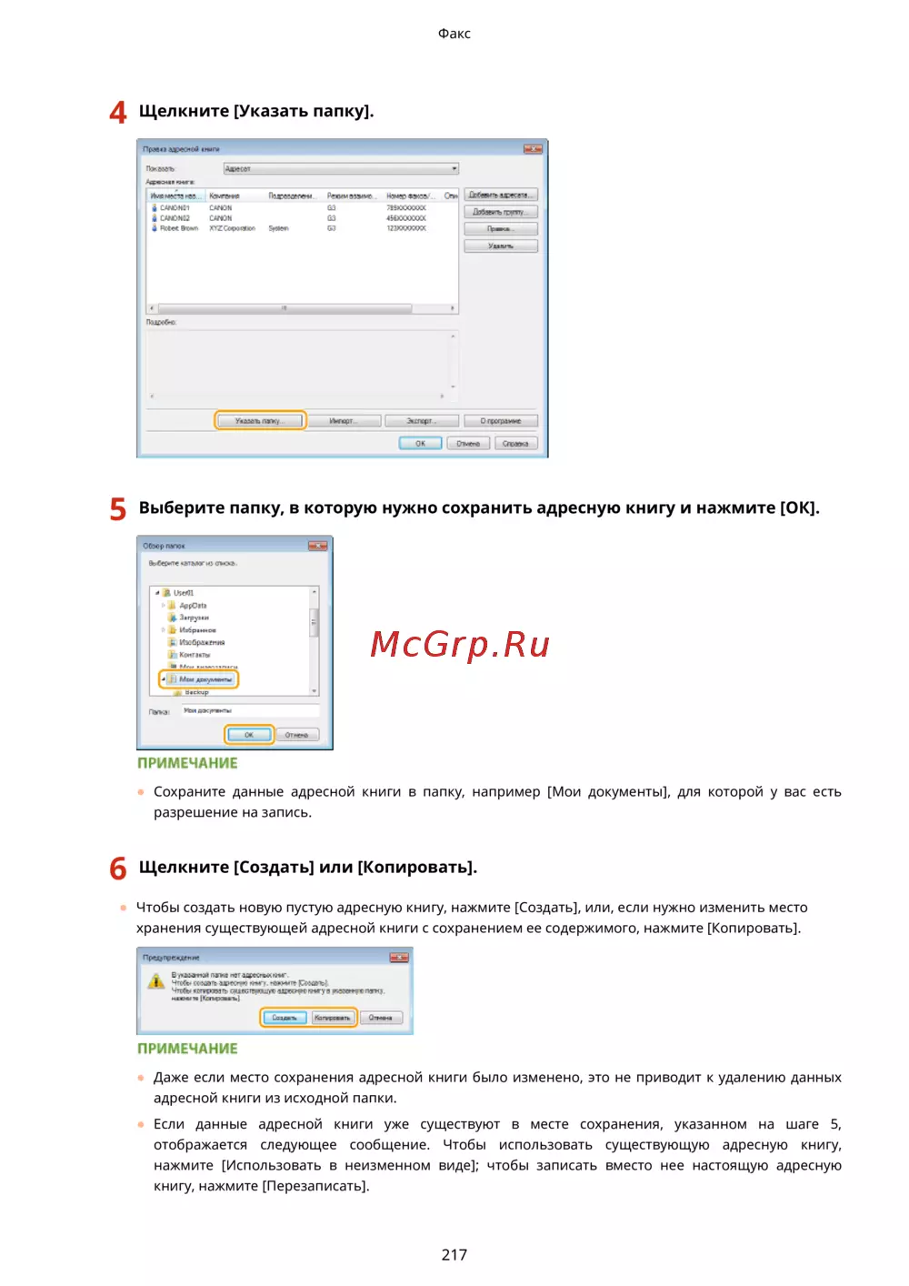 ● Сохраните данные адресной книги в папку, например [Мои документы], для которой у вас есть