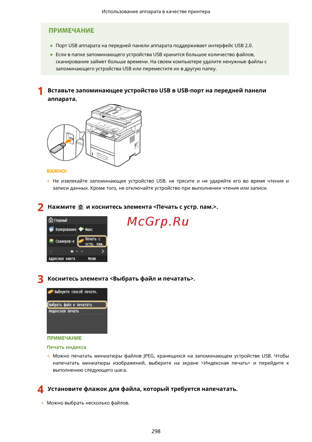 ● Можно печатать миниатюры файлов JPEG, хранящихся на запоминающем устройстве USB. Чтобы