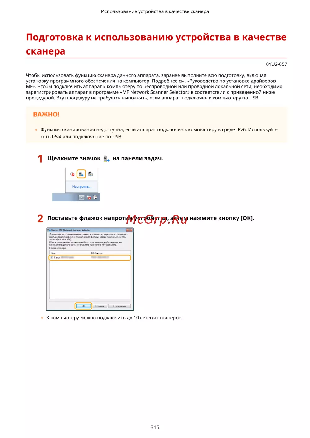 ● Функция сканирования недоступна, если аппарат подключен к компьютеру в среде IPv6. Используйте