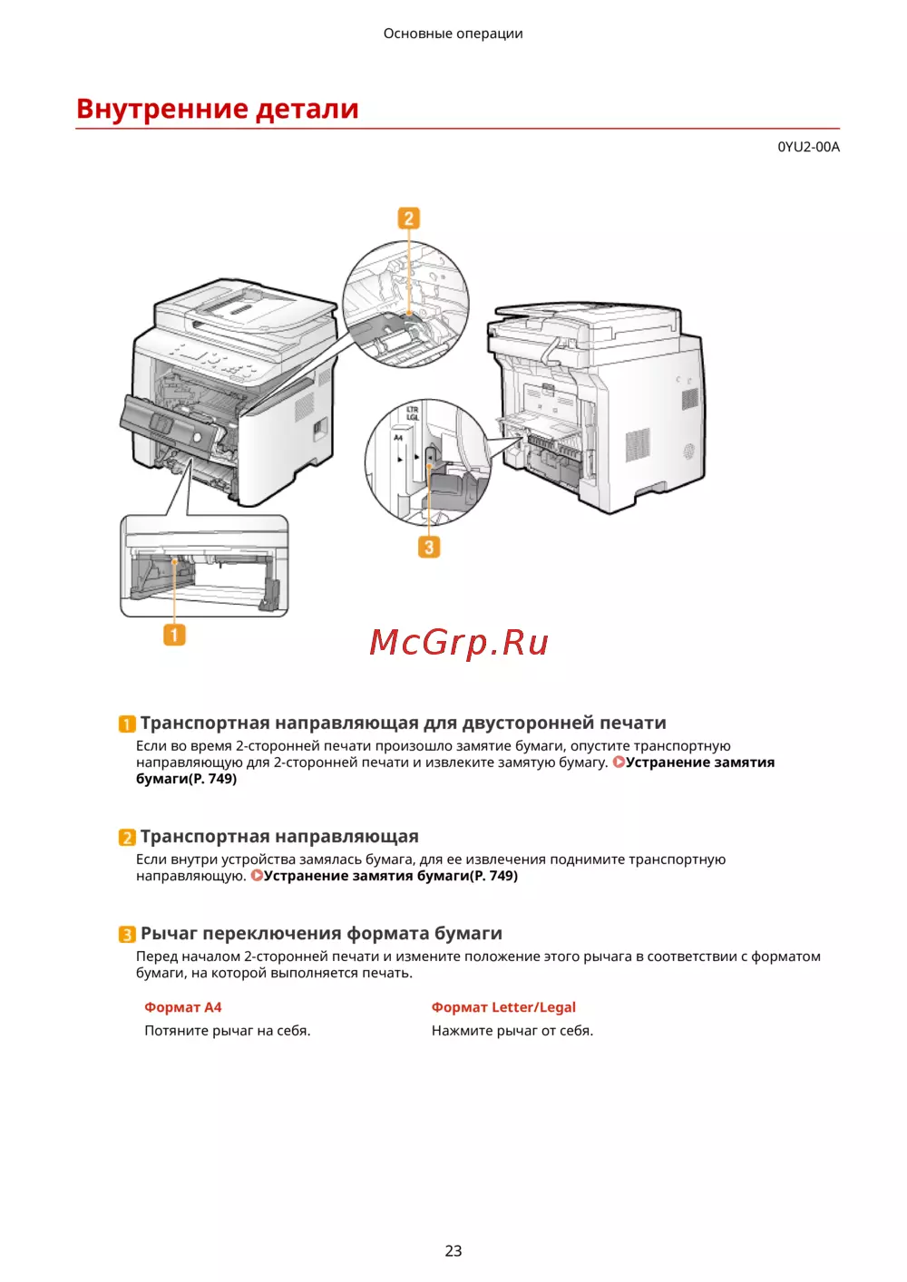 направляющую. Устранение замятия бумаги(P. 749)