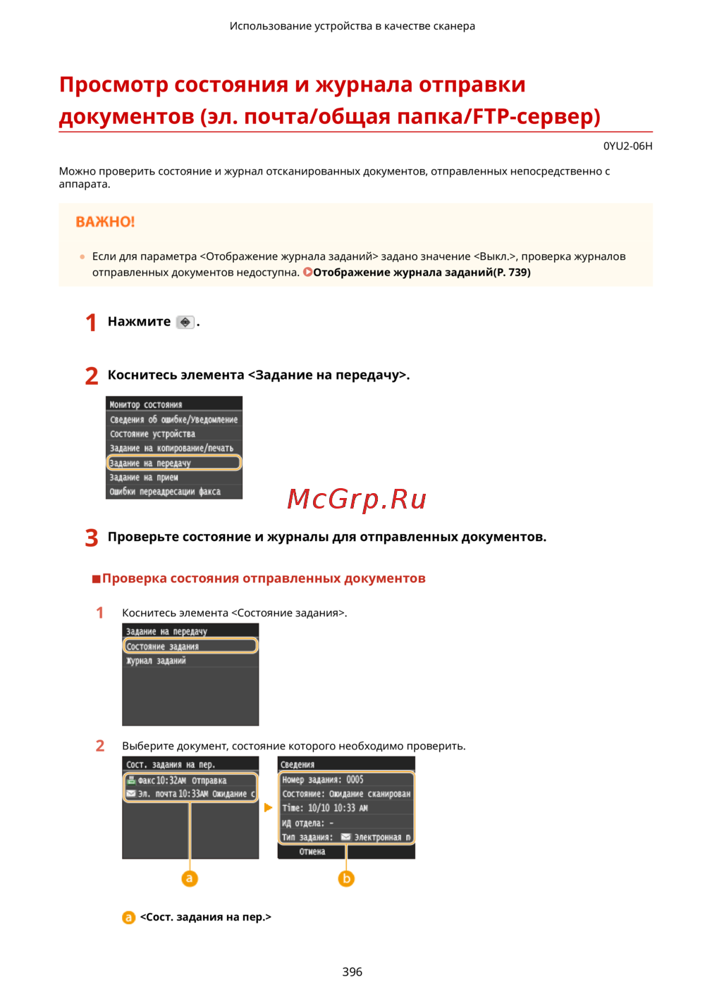 Можно проверить состояние и журнал отсканированных документов, отправленных непосредственно с