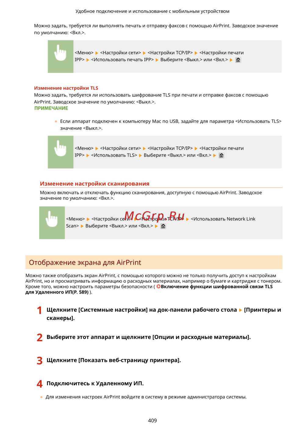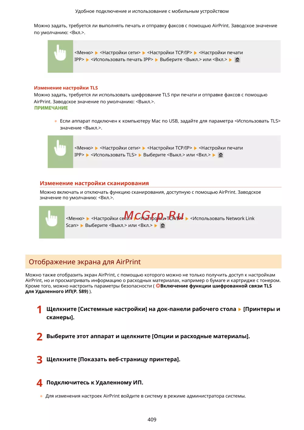 Canon i-Sensys MF416dw Лазерный \ светодиодный, Серый, Черно-белая, А4 — настройки AirPrint: Печать, Факсы и Сканирование [419/949]