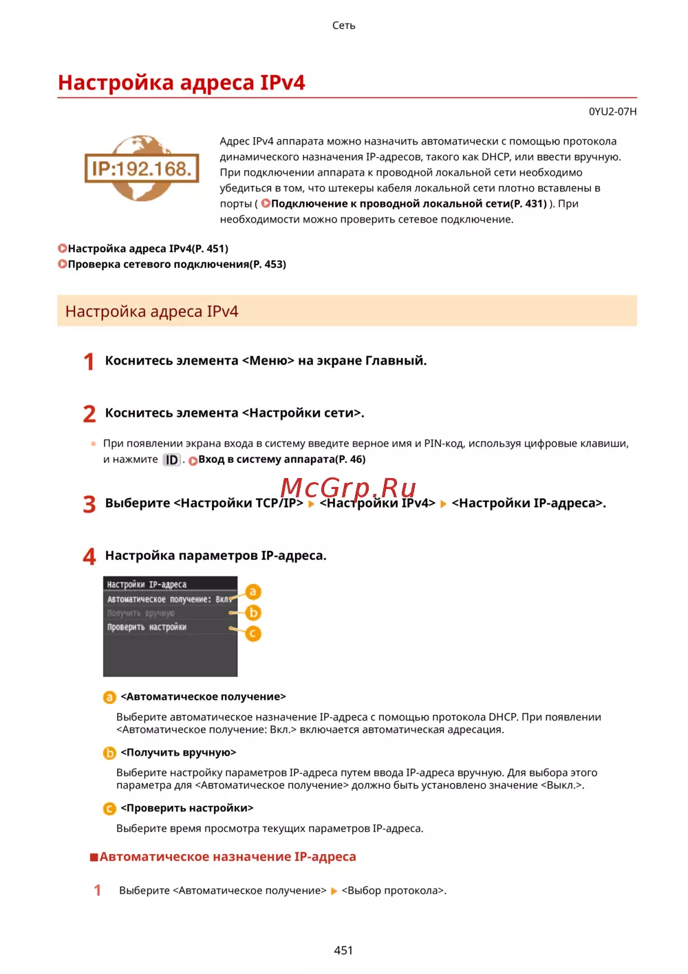 Canon i-Sensys MF416dw Лазерный \ светодиодный, Серый, Черно-белая, А4 — настройка адреса IPv4: автоматическое и ручное назначение [461/949]