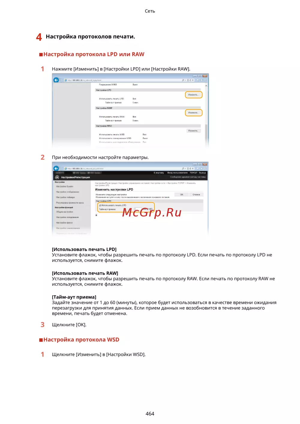 Узнайте, как настроить протоколы печати LPD, RAW и WSD. Пошаговые инструкции помогут вам легко управлять параметрами печати и тайм-аутами.