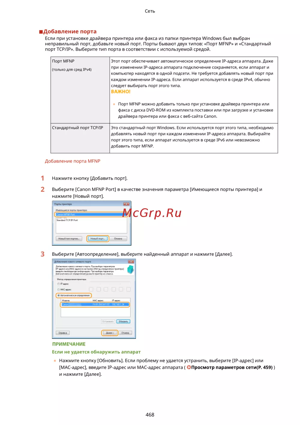 ● Порт MFNP можно добавить только при установке драйвера принтера или