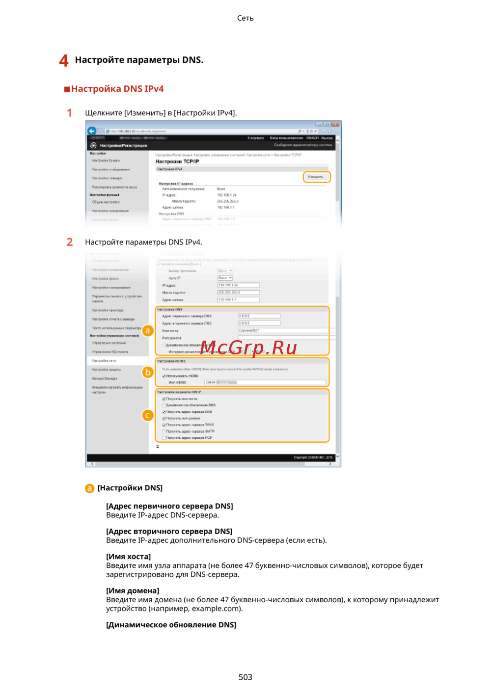 Canon i-Sensys MF416dw Лазерный \ светодиодный, Серый, Черно-белая, А4 — настройка параметров DNS для IPv4: пошаговое руководство [513/949]