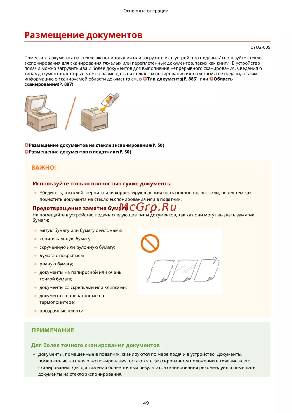 типах документов, которые можно размещать на стекле экспонирования или в устройстве подачи, а также