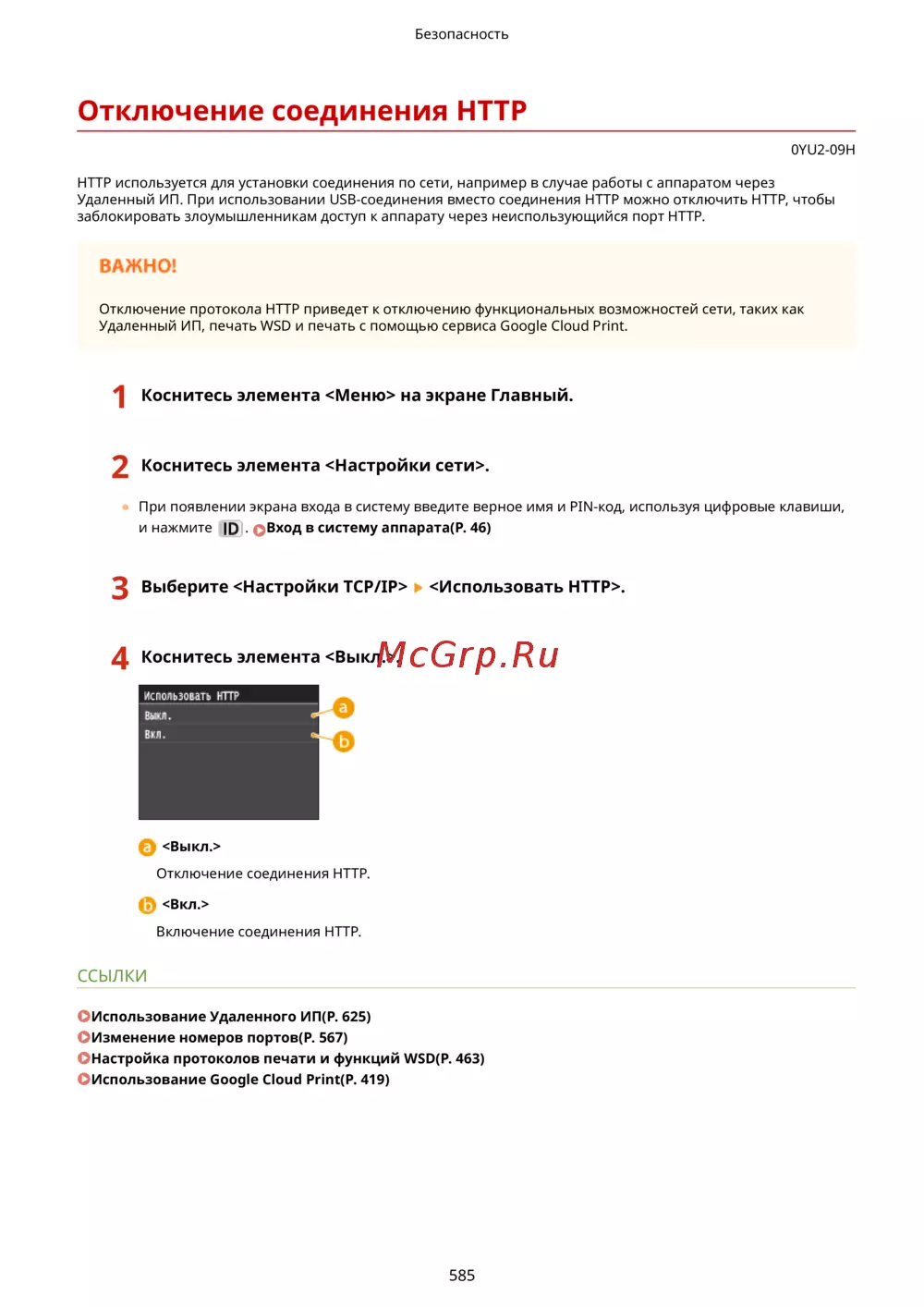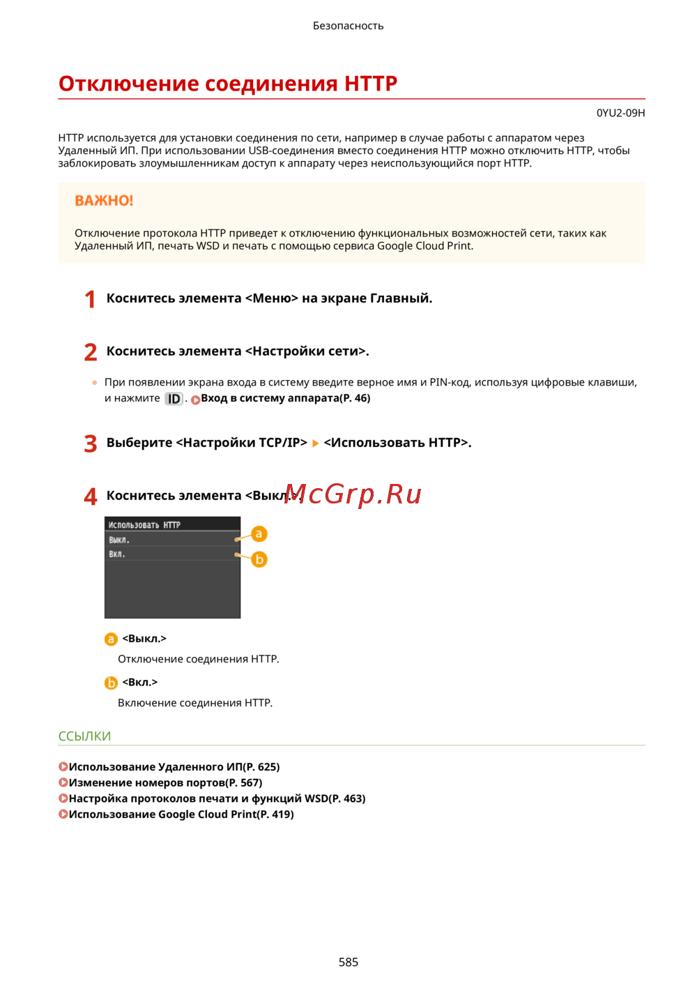 Canon i-Sensys MF416dw Лазерный \ светодиодный, Серый, Черно-белая, А4 — как отключить соединение HTTP для повышения безопасности устройства [595/949]