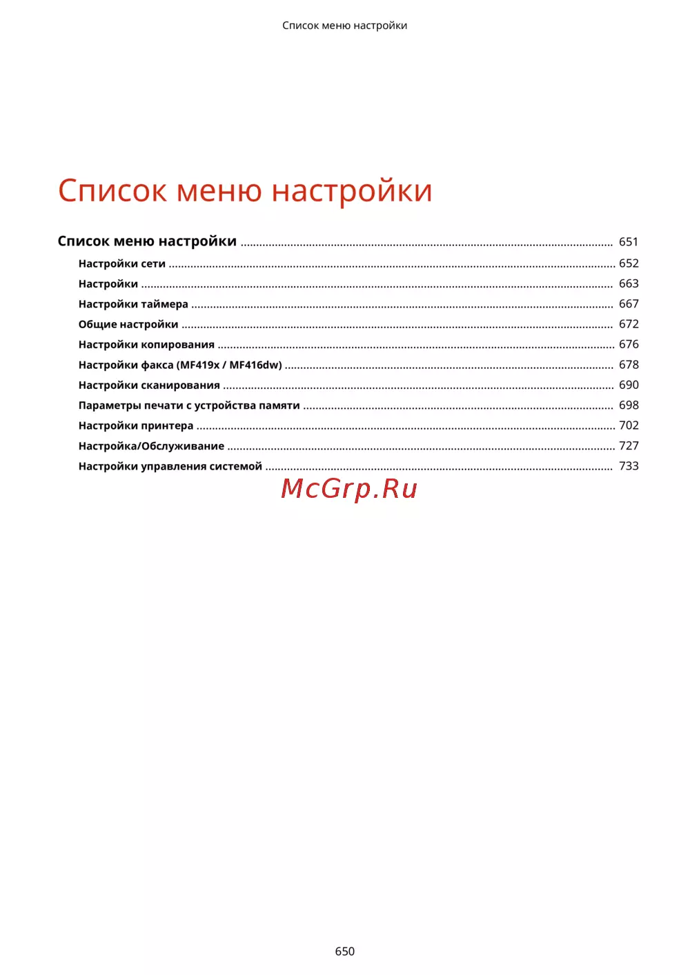 Canon i-Sensys MF416dw Лазерный \ светодиодный, Серый, Черно-белая, А4 [660/949] Список меню настройки