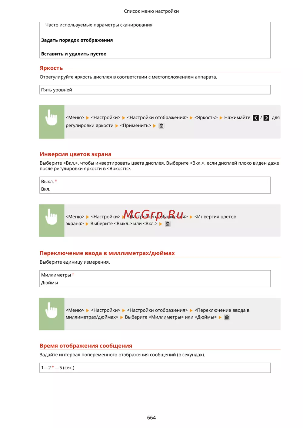 Canon i-Sensys MF416dw Лазерный \ светодиодный, Серый, Черно-белая, А4 — настройки дисплея: яркость, инверсия цветов и единицы измерения [674/949]
