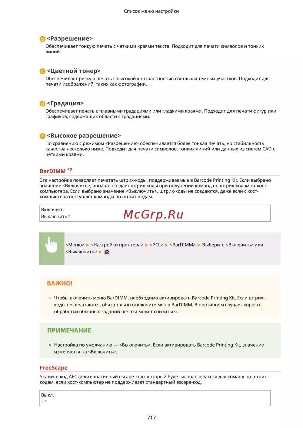 ● Настройка по умолчанию — <Выключить>. Если активировать Barcode Printing Kit, значение