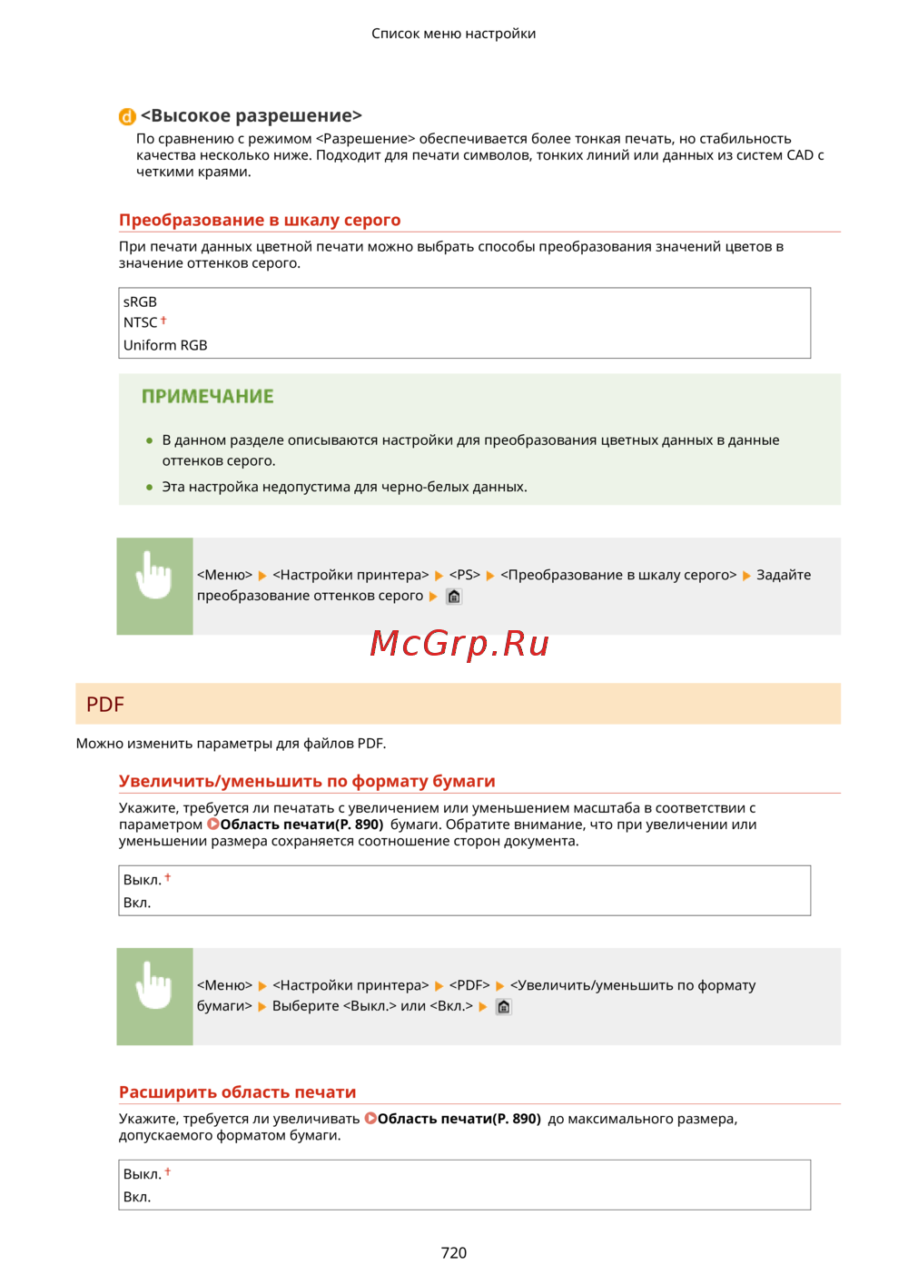<Меню> <Настройки принтера> <PS> <Преобразование в шкалу серого> Задайте