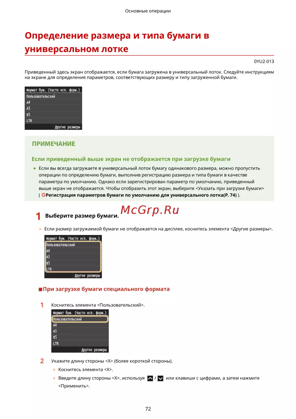 операции по определению бумаги, выполнив регистрацию размера и типа бумаги в качестве