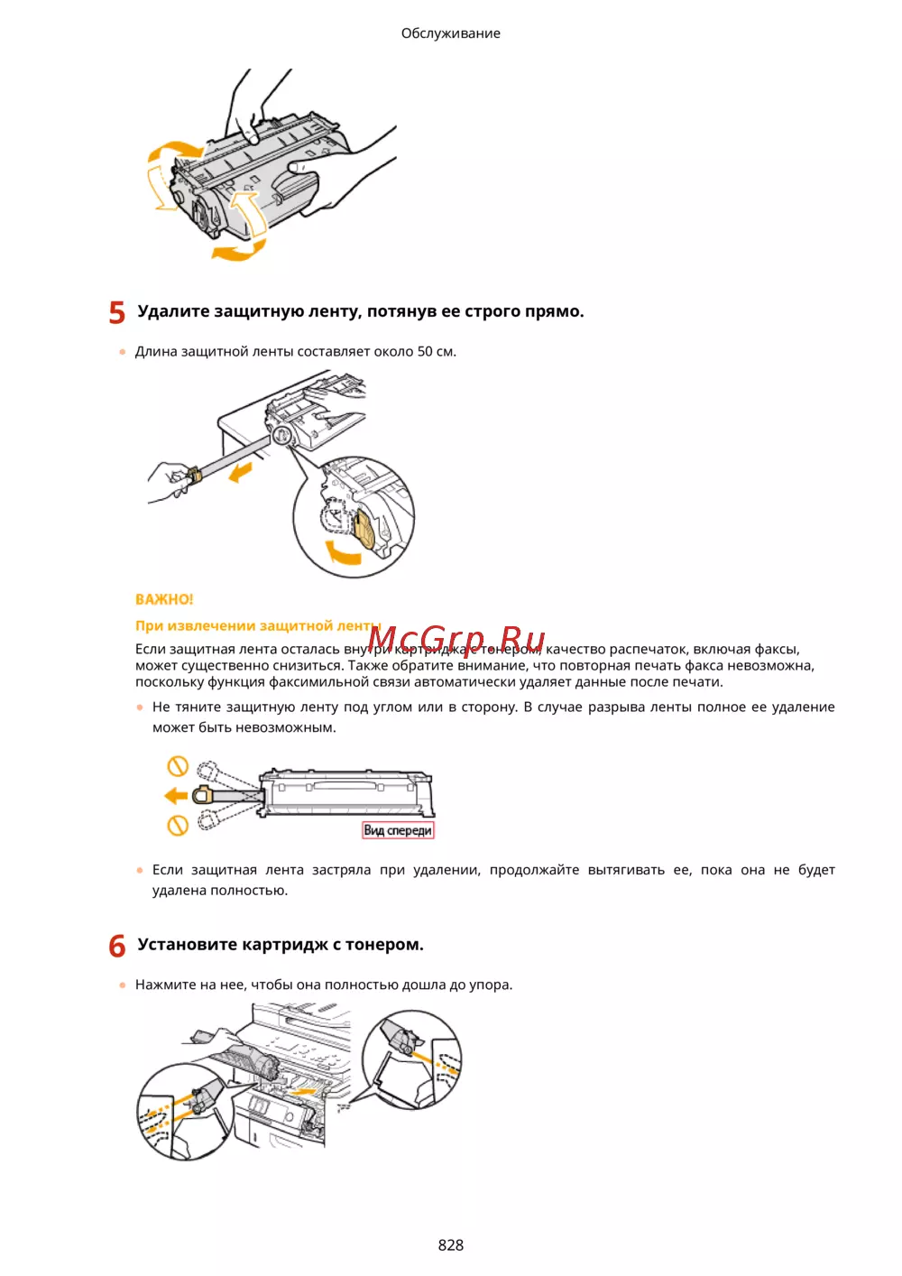 Canon i-Sensys MF416dw Лазерный \ светодиодный, Серый, Черно-белая, А4 — правильное удаление защитной ленты из картриджа с тонером [838/949]