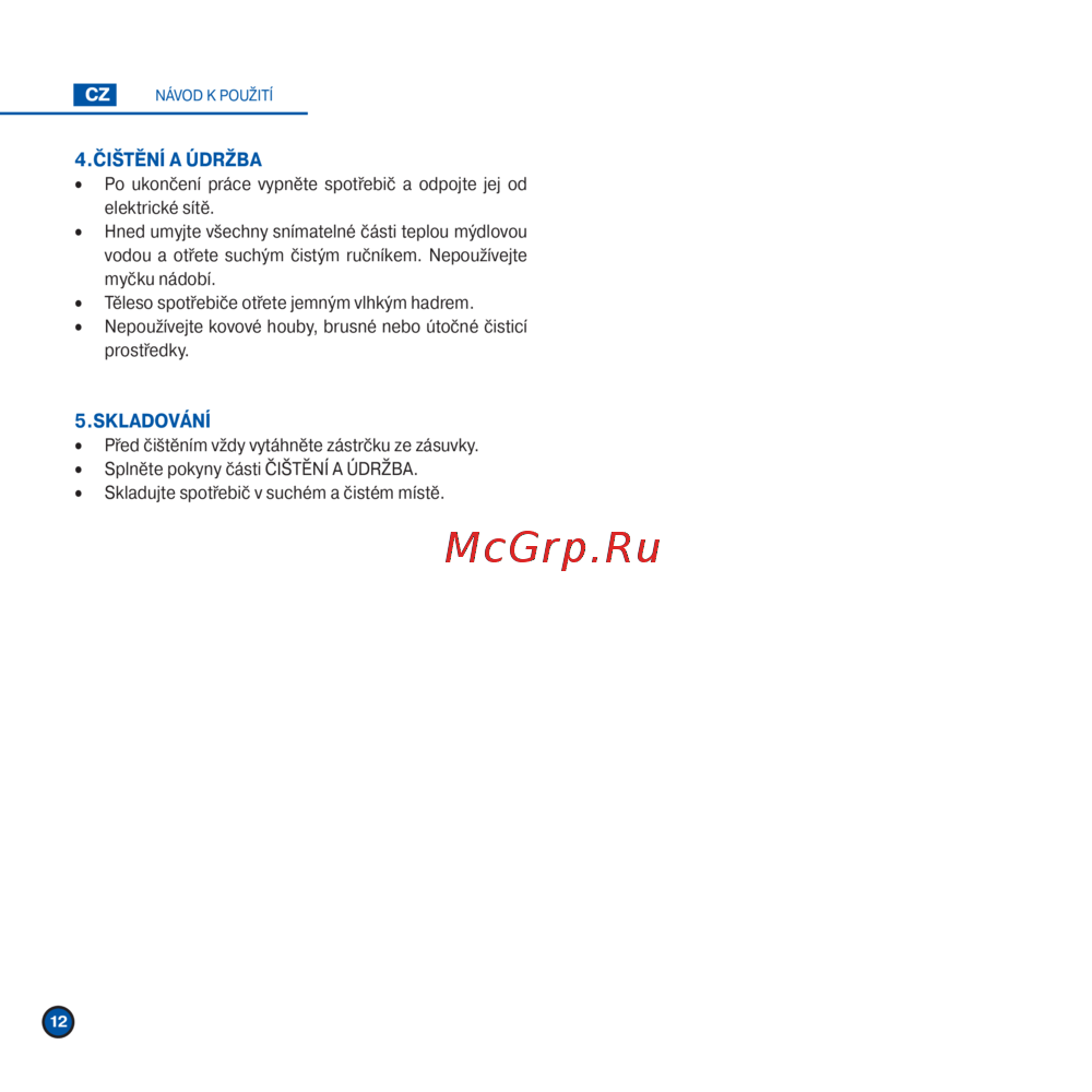 • Skladujte spotřebič v suchém a čistém místě.