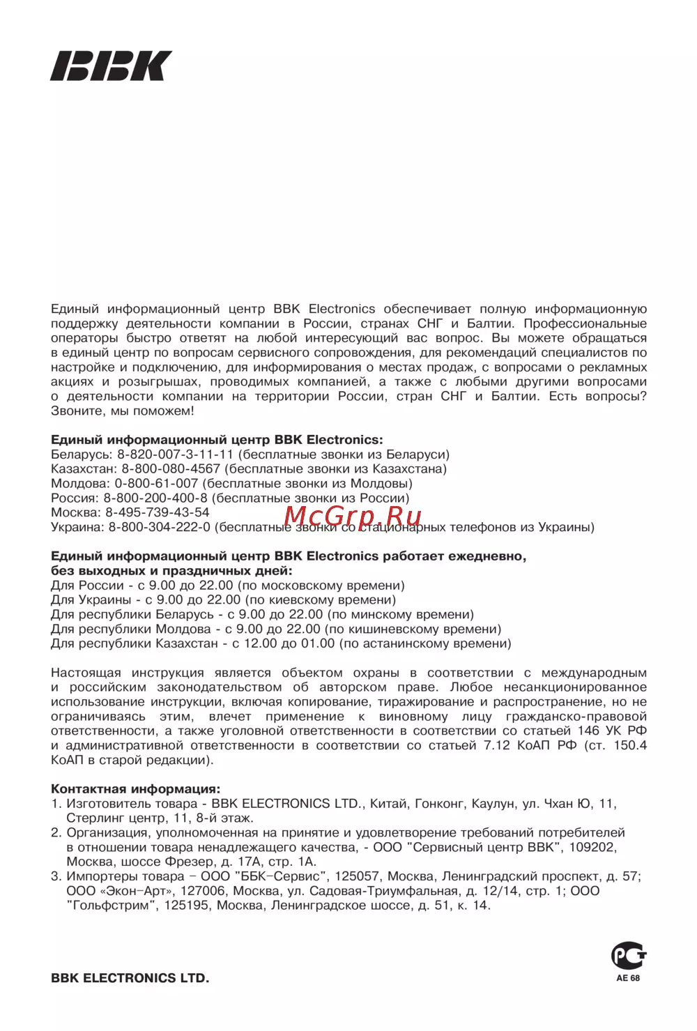 ккк Единый информационный центр ВВК Electronics обеспечивает полную информац поддержку деятельности компании в России странах СНГ и Балтии Профессион операторы быстро ответят на любой интересующий вас вопрос Вы можете обра в единый центр по вопросам сервисного сопровождения для рекомендаций специалист настройке и подключению для информирования о местах продаж с вопросами о рек акциях и розыгрышах проводимых компанией а также с любыми другими воп о деятельности компании на территории России стран СНГ и Балтии Есть во Звоните мы поможем Единый информационный центр ВВК Electronics Беларусь 8 820 007 3 11 11 бесплатные звонки из Беларуси Казахстан 8 800 080 4567 бесплатные звонки из Казахстана Молдова 0 800 61 007 бесплатные звонки из Молдовы Россия 8 800 200 400 8 бесплатные звонки из России Москва 8 495 739 43 54 Украина 8 800 304 222 0 бесплатные звонки со стационарных телефонов из Украины Единый информационный центр ВВК Electronics работает ежедневно без выходных и праздничных дней Для России с 9 00 до 22 00 по московскому времени Для Украины с 9 00 до 22 00 по киевскому времени Для республики Беларусь с 9 00 до 22 00 по минскому времени Для республики Молдова с 9 00 до 22 00 по кишиневскому времени Для республики Казахстан с 12 00 до 01 00 по астанинскому времени Настоящая инструкция является объектом охраны в соответствии с междуна и российским законодательством об авторском праве Любое несанкциониро использование инструкции включая копирование тиражирование и распространение ограничиваясь этим влечет применение к виновному лицу гражданско пр ответственности а также уголовной ответственности в соответствии со статьей 146 У и административной ответственности в соответствии со статьей 7 12 КоАП РФ ст КоАП в старой редакции Контактная информация 1 Изготовитель товара ВВК ELECTRONICS LTD Китай Гонконг Каулун ул Чхан Ю 11 Стерлинг центр 11 8 й этаж 2 Организация уполномоченная на принятие и удовлетворение требований потребителей в отношении товара ненадлежащего качества ООО Сервисный центр ВВК 109202 Москва шоссе Фрезер д 17А стр 1А 3 Импортеры товара ООО ББК Сервис 125057 Москва Ленинградский проспект д 57 ООО Экон Арт 127006 Москва ул Садовая Триумфальная д 12 14 стр 1 000 Гольфстрим 125195 Москва Ленинградское шоссе д 51 к 14