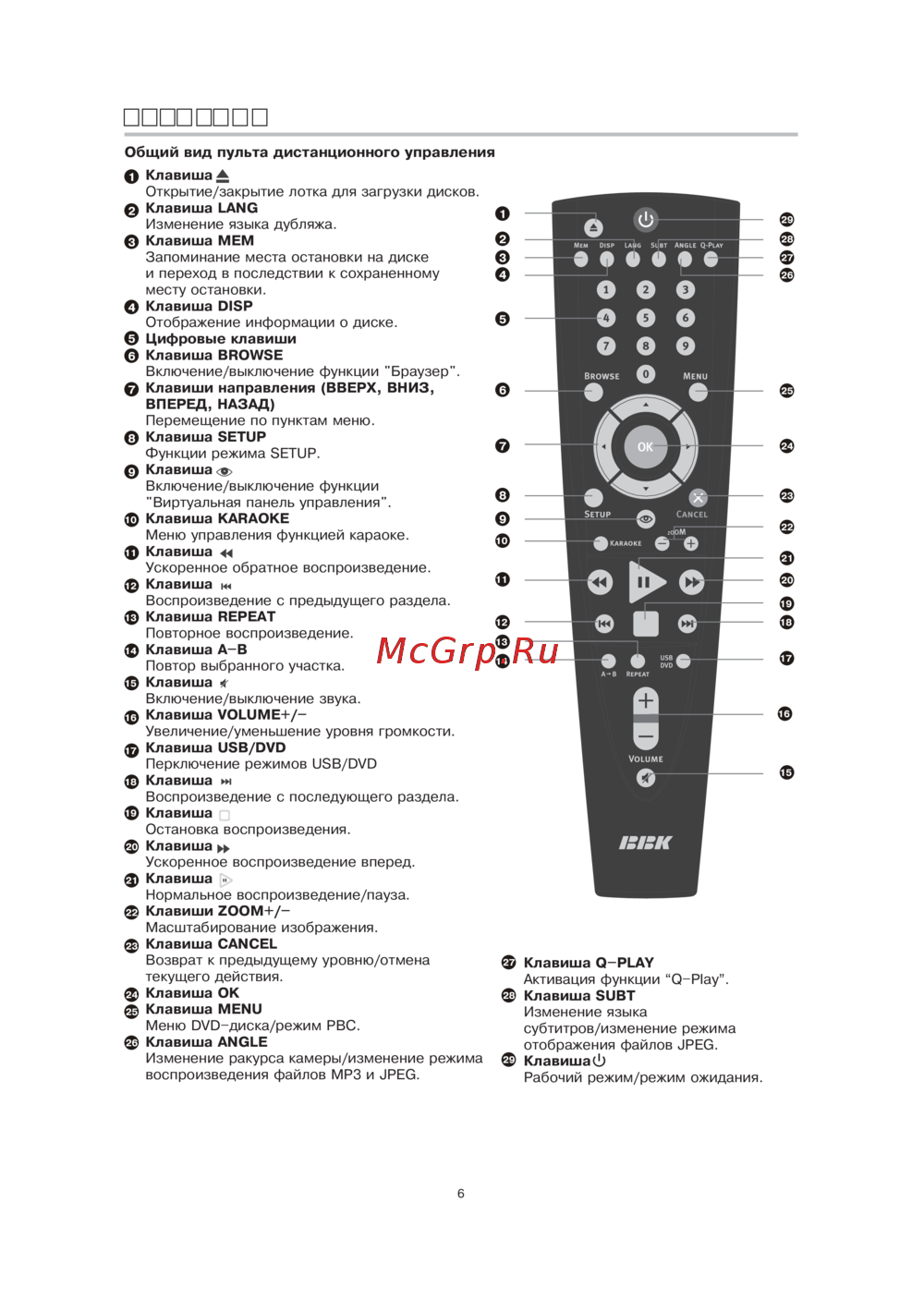 Общий вид пульта дистанционного управления О Клавиша Л Открытие закрытие лотка для загрузки дисков 0 Клавиша LANG Изменение языка дубляжа 0 Клавиша МЕМ Запоминание места остановки надиске и переход в последствии к сохраненному месту остановки о Клавиша DISP Отображение информации о диске 0 Цифровые клавиши 0 Клавиша BROWSE Включение выключение функции Браузер О Клавиши направления ВВЕРХ ВНИЗ ВПЕРЕД НАЗАД Перемещение по пунктам меню 0 Клавиша SETUP Функции режима SETUP 0 Клавиша я Включение выключение функции Виртуальная панель управления ф Клавиша KARAOKE Меню управления функцией караоке ф Клавиша Ускоренное обратное воспроизведение Клавиша ж Воспроизведение с предыдущего раздела Клавиша REPEAT Повторное воспроизведение Клавиша А В Повтор выбранного участка Клавиша Включение выключение звука ф Клавиша VOLUME Увеличение уменьшение уровня громкости ф Клавиша USB DVD Перключение режимов USB DVD ф Клавиша ж Воспроизведение с последующего раздела ф Клавиша Остановка воспроизведения ф Клавиша Ускоренное воспроизведение вперед ф Клавиша Нормальное воспроизведение пауза ф Клавиши ZOOM Масштабирование изображения ф Клавиша CANCEL Возврат к предыдущему уровню отмена текущего действия ф Клавиша ОК ф Клавиша MENU Меню DVD диска режим РВС ф Клавиша ANGLE Изменение ракурса камеры изменение воспроизведения файлов MP3 и JPEG режима 6 ф Клавиша Q PLAY Активация функции Q Play Ф Клавиша SUBT Изменение языка субтитров изменение режима отображения файлов JPEG Ф Клавишаф Рабочий режим режим ожидания