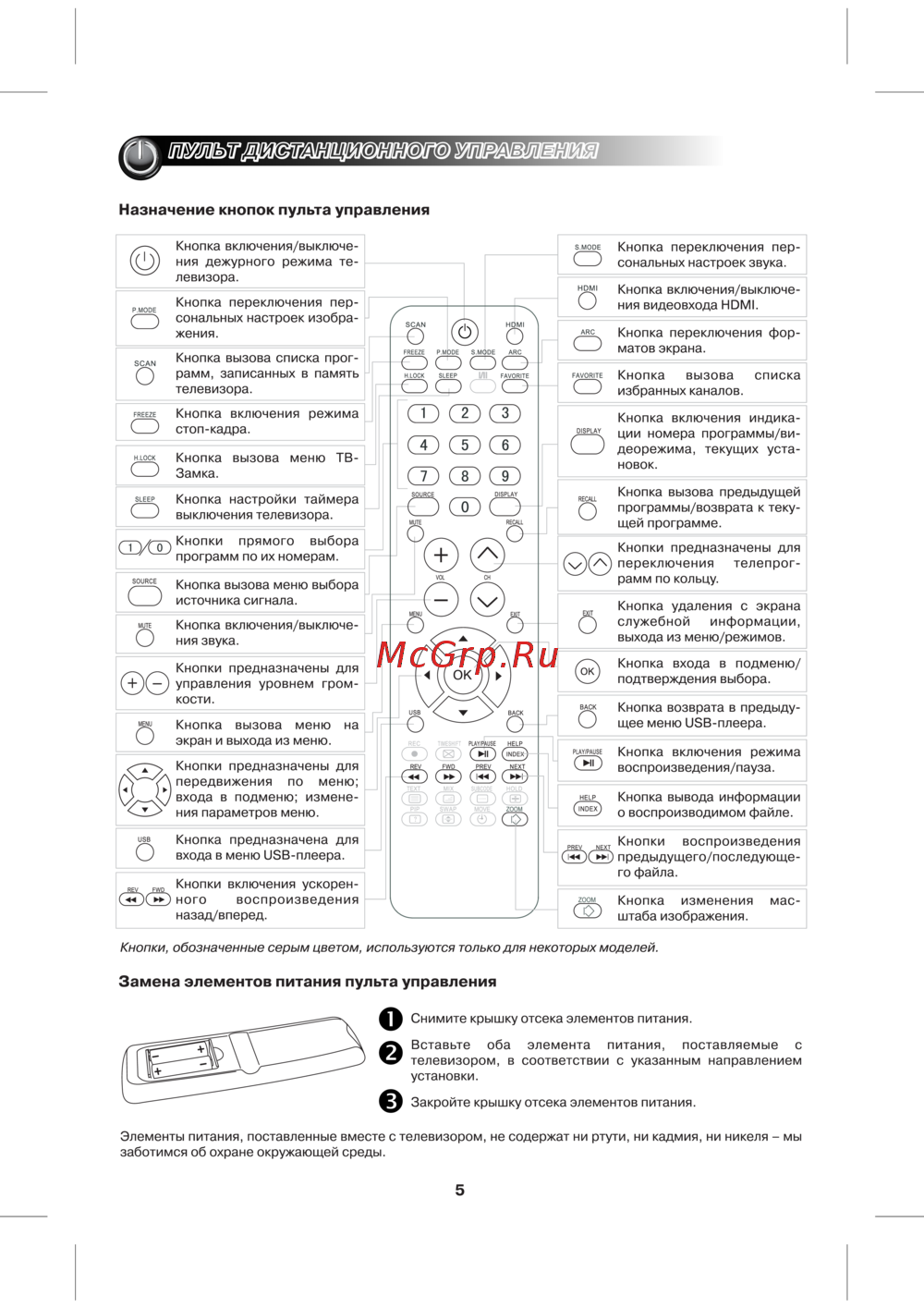 Назначение кнопок пульта управления Кнопка включения выключения дежурного режима те левизора P MODE SCAN FREEZE Н LOCK SLEEP ЗЧООЕ Кнопка переключения перС сональных настроек звука Кнопка включения выключеО ния видеовхода HDMI Кнопка переключения пер сональных настроек изображения HD Кнопка вызова списка прог рамм записанных в память телевизора FAVORITE Кнопка включения режима стоп кадра Кнопка Замка Кнопка переключения фор матов экрана Кнопка вызова избранных каналов FAVORITE пкр вызова меню ТВ Кнопка включения индикации номера программы видеорежима текущих уста новок Кнопка вызова предыдущей О программы возврата к теку щей программе Кнопка настройки таймера выключения телевизора Кнопки прямого выбора œ œ программ по их номерам SOURCE списка Кнопки предназначены для переключения телепрог рамм по кольцу Кнопка вызова меню выбора источника сигнала Кнопка удаления с экрана служебной информации выхода из меню режимов О ЛЕ Кнопка включения выключеО ния звука Кнопка входа в подменю подтверждения выбора Кнопки предназначены для управления уровнем гром кости в Кнопка возврата в предыдуО щее меню USB плеера Кнопка вызова меню О экран и выхода из меню Кнопка включения режима воспроизведения пауза Кнопки предназначены для передвижения по меню входа в подменю измене ния параметров меню Кнопка вывода информации 0 9 о воспроизводимом файле изв Кнопка предназначена для входа в меню иЗВ плеера Кнопки воспроизведения предыдущего последующего файла ВЕХТ ОТ REV FWD Кнопки включения ускорен Т н 0 ного воспроизведения назад вперед ZOOM Кнопка изменения штаба изображения мас Кнопки обозначенные серым цветом используются только для некоторых моделей Замена элементов питания пульта управления Снимите крышку отсека элементов питания Вставьте оба элемента питания поставляемые с в соответствии с указанным направлением телевизором установки Закройте крышку отсека элементов питания Элементы питания поставленные вместе с телевизором не содержат ни ртути ни кадмия ни никеля мы заботимся об охране окружающей среды 5