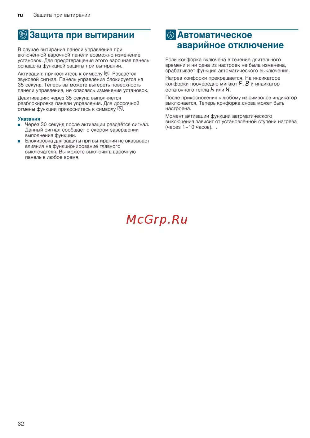 Описание функций защиты при вытирании и автоматического отключения варочной панели. Узнайте, как работают системы безопасности и экономии энергии вашего кухонного оборудования.