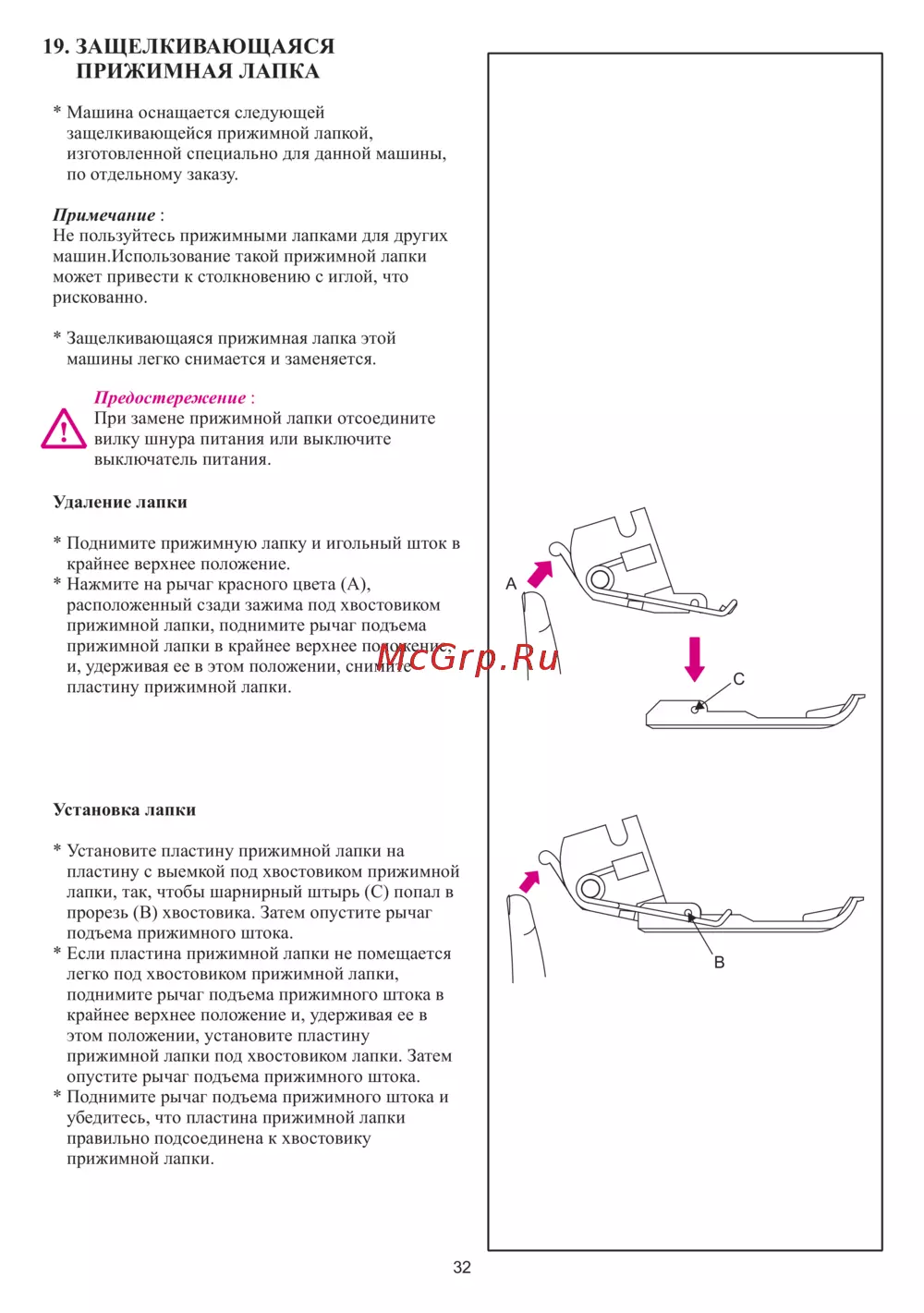 Узнайте, как правильно установить и заменить защелкивающуюся прижимную лапку на швейной машине. Следуйте инструкциям для безопасного использования и предотвращения повреждений.