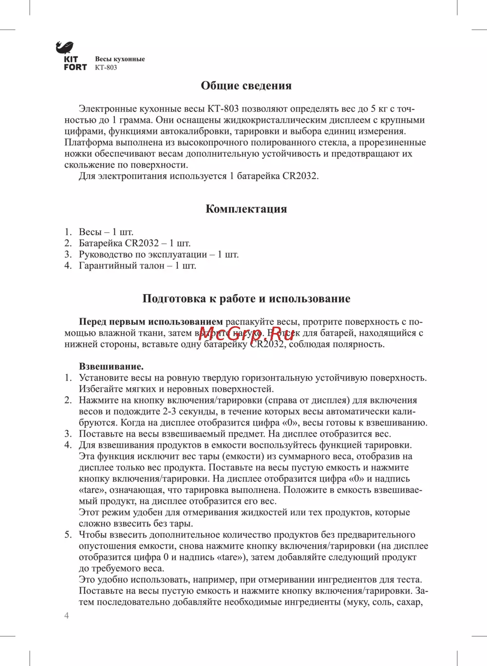 KIT Весы кухонные FORT КТ 803 Общие сведения Электронные кухонные весы КТ 803 позволяют определять вес до 5 кг с точ ностью до 1 грамма Они оснащены жидкокристаллическим дисплеем с крупными цифрами функциями автокалибровки тарировки и выбора единиц измерения Платформа выполнена из высокопрочного полированного стекла а прорезиненные ножки обеспечивают весам дополнительную устойчивость и предотвращают их скольжение по поверхности Для электропитания используется 1 батарейка СК2032 Комплектация 1 Весы 1 шт 2 Батарейка СК2032 1 шт 3 Руководство по эксплуатации 1 шт 4 Гарантийный талон 1 шт Подготовка к работе и использование Перед первым использованием распакуйте весы протрите поверхность с по мощью влажной ткани затем вытрите насухо В отсек для батарей находящийся с нижней стороны вставьте одну батарейку CR2032 соблюдая полярность Взвешивание 1 Установите весы на ровную твердую горизонтальную устойчивую поверхность Избегайте мягких и неровных поверхностей 2 Нажмите на кнопку включения тарировки справа от дисплея для включения весов и подождите 2 3 секунды в течение которых весы автоматически кали бруются Когда на дисплее отобразится цифра О весы готовы к взвешиванию 3 Поставьте на весы взвешиваемый предмет На дисплее отобразится вес 4 Для взвешивания продуктов в емкости воспользуйтесь функцией тарировки Эта функция исключит вес тары емкости из суммарного веса отобразив на дисплее только вес продукта Поставьте на весы пустую емкость и нажмите кнопку включения тарировки На дисплее отобразится цифра О и надпись tare означающая что тарировка выполнена Положите в емкость взвешивае мый продукт на дисплее отобразится его вес Этот режим удобен для отмеривания жидкостей или тех продуктов которые сложно взвесить без тары 5 Чтобы взвесить дополнительное количество продуктов без предварительного опустошения емкости снова нажмите кнопку включения тарировки на дисплее отобразится цифра 0 и надпись tare затем добавляйте следующий продукт до требуемого веса Это удобно использовать например при отмеривании ингредиентов для теста Поставьте на весы пустую емкость и нажмите кнопку включения тарировки За тем последовательно добавляйте необходимые ингредиенты муку соль сахар 4
