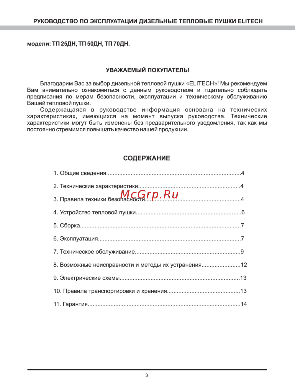 РУКОВОДСТВО ПО ЭКСПЛУАТАЦИИ ДИЗЕЛЬНЫЕ ТЕПЛОВЫЕ ПУШКИ Е1 1ТЕСН модели ТП 25ДН ТП 50ДН ТП 70ДН УВАЖАЕМЫЙ ПОКУПАТЕЛЬ Благодарим Вас за выбор дизельной тепловой пушки ЕЫТЕСН Мы рекомендуем Вам внимательно ознакомиться с данным руководством и тщательно соблюдать предписания по мерам безопасности эксплуатации и техническому обслуживанию Вашей тепловой пушки Содержащаяся в руководстве информация основана на технических характеристиках имеющихся на момент выпуска руководства Технические характеристики могут быть изменены без предварительного уведомления так как мы постоянно стремимся повышать качество нашей продукции СОДЕРЖАНИЕ 1 Общие сведения 4 2 Технические характеристики 4 3 Правила техники безопасности 4 4 Устройство тепловой пушки 6 5 Сборка 7 6 Эксплуатация 7 7 Техническое обслуживание 9 8 Возможные неисправности и методы их устранения 12 9 Электрические схемы 13 10 Правила транспортировки и хранения 13 11 Гарантия 14 з