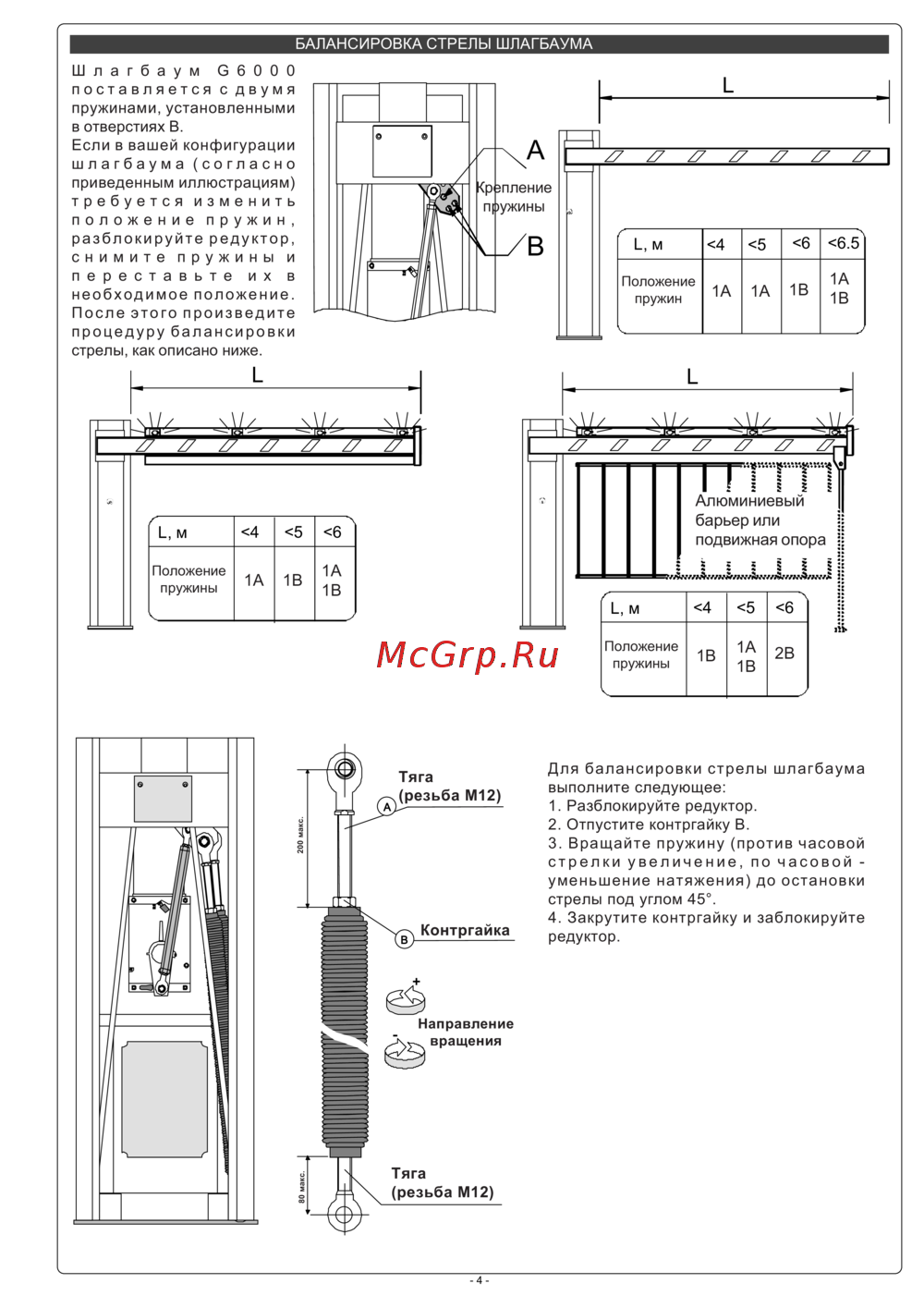 БАЛАНСИРОВКА СТРЕЛЫ ШЛАГБАУМА Шлагбаум 66000 поставляется сдвумя пружинами установленными в отверстиях В Если в вашей конфигурации шлагбаума согласно приведенным иллюстрациям требуется изменить положение пружин разблокируйте редуктор снимите пружины и переставьте их в необходимое положение После этого произведите процедуру балансировки стрелы как описано ниже Г м Положение пружины ____________ 4 5 6 1А 1В 1А 1В ____У Тяга резьба М12 Контргайка Направление вращения Тяга резьба М12 4 Для балансировки стрелы шлагбаума выполните следующее 1 Разблокируйте редуктор 2 Отпустите контргайку В 3 Вращайте пружину против часовой стрелки увеличение по часовой уменьшение натяжения до остановки стрелы под углом 45 4 Закрутите контргайку и заблокируйте редуктор