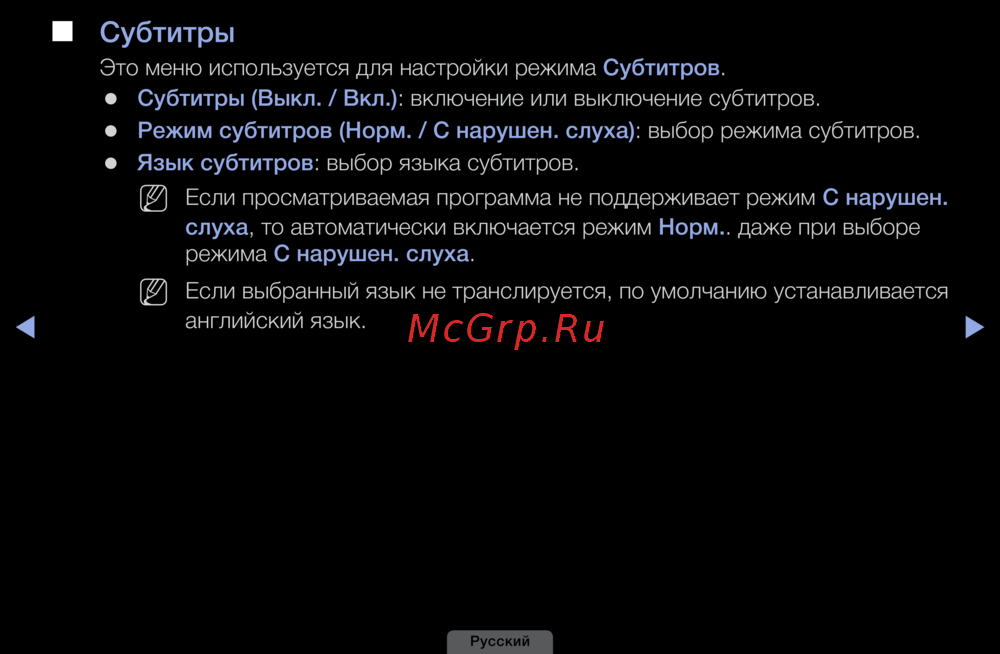 Режим❑субтитров❑(Норм.❑/❑С❑нарушен.❑слуха): выбор режима субтитров.