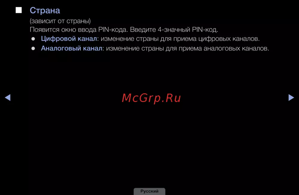 Цифровой❑канал: изменение страны для приема цифровых каналов.