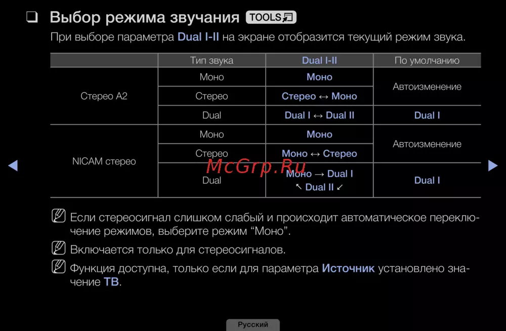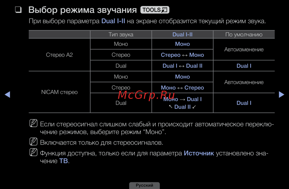 При выборе параметра Dual I-II на экране отобразится текущий режим звука.