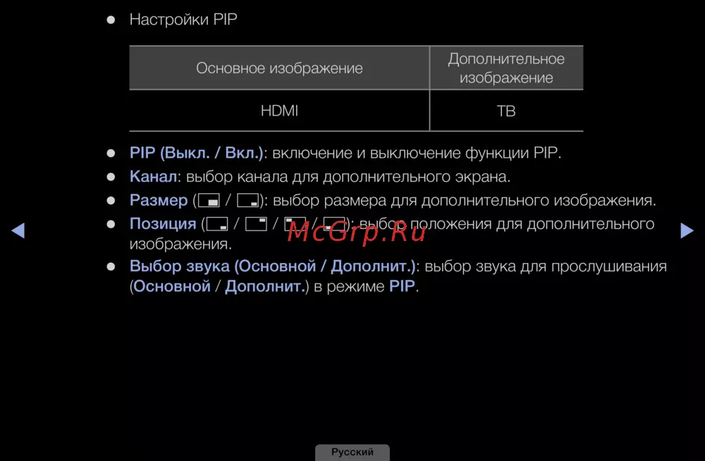 PIP❑(Выкл.❑/❑Вкл.): включение и выключение функции PIP.