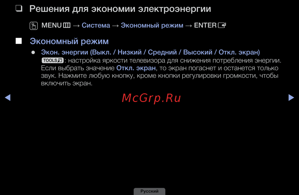 Экон.❑энергии❑(Выкл.❑/❑Низкий❑/❑Средний❑/❑Высокий❑/❑Откл.❑экран)